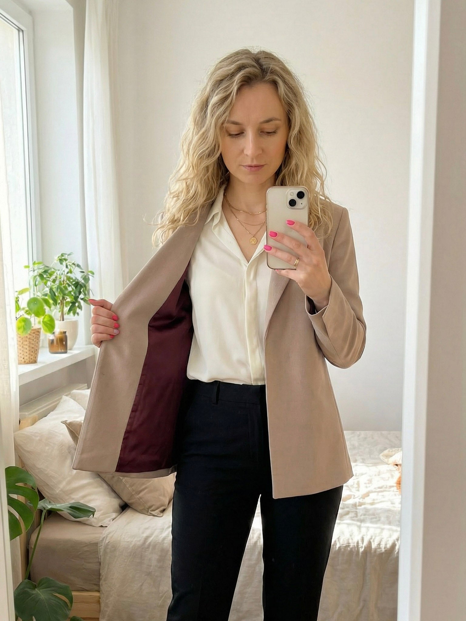 Elegancka marynarka w odcieniu ciepłego beżu to doskonały wybór do stylizacji biznesowych i casualowych. Model posiada paseczek do zawiązania w talii, który podkreśla sylwetkę i pozwala na indywidualne dopasowanie. Klasyczne klapy nadają całości ponadczasowego charakteru. Wnętrze marynarki wykończone jest podszewką w kolorze ciemnej wiśni, co dodaje jej wyjątkowej elegancji. Materiał jest miękki i przyjemny w dotyku, zapewniając komfort noszenia przez cały dzień. Marynarka świetnie komponuje się zarówno ze spodniami, jak i sukienkami. To uniwersalny element garderoby, który sprawdzi się w wielu sezonach.