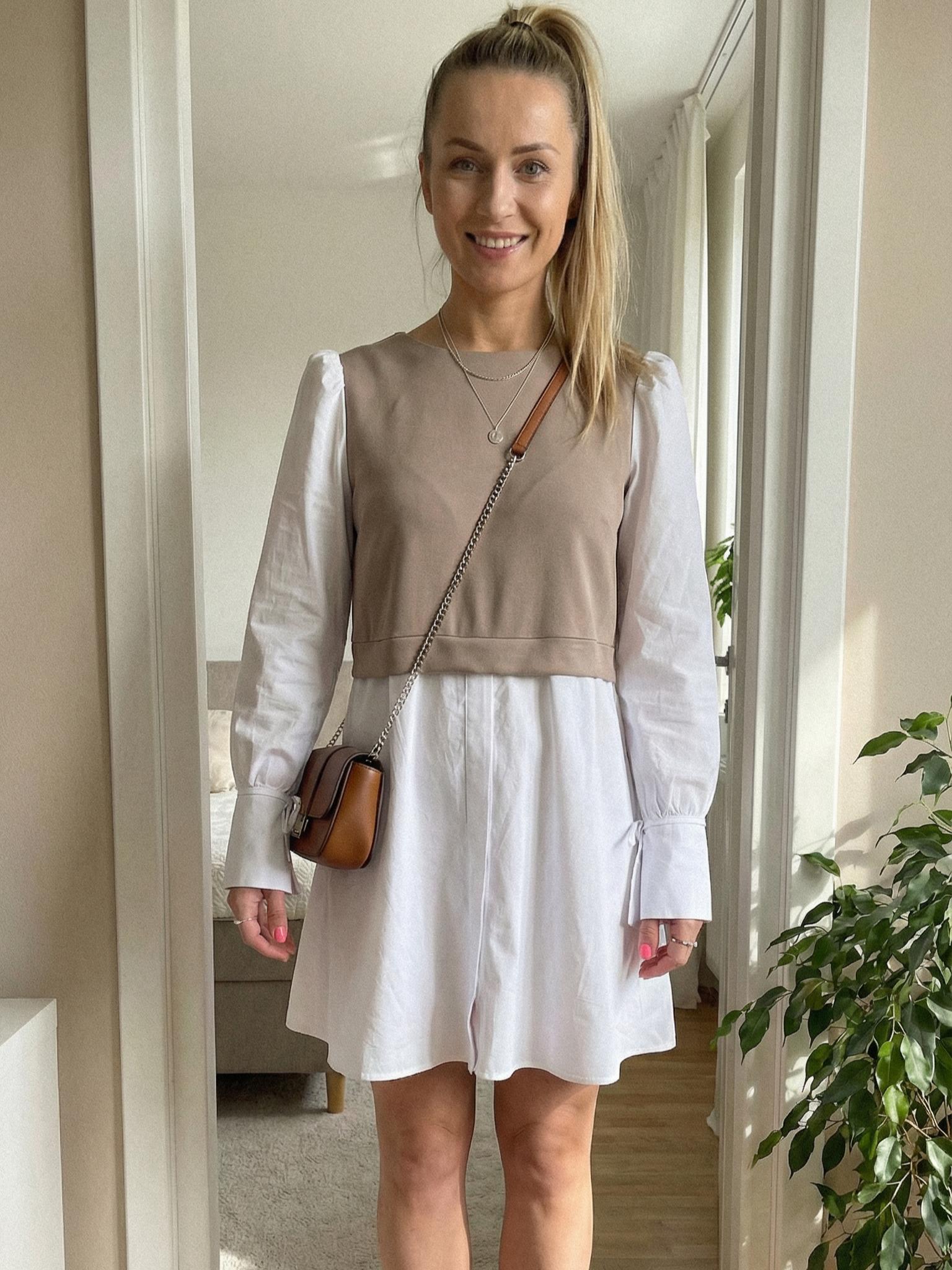 Stylowa sukienka o oryginalnym, dwuwarstwowym fasonie łączy w sobie elegancję i nowoczesność. Górna warstwa w odcieniu beżu subtelnie kontrastuje z białą, koszulową bazą. Model posiada długie rękawy z mankietami, które nadają całości lekkości i formy. Luźny krój zapewnia komfort noszenia i swobodę ruchów. Delikatnie rozkloszowany dół dodaje sylwetce lekkości. Sukienka sprawdzi się zarówno w codziennych stylizacjach, jak i na bardziej eleganckie okazje. To nietuzinkowa propozycja dla kobiet ceniących unikalne detale.