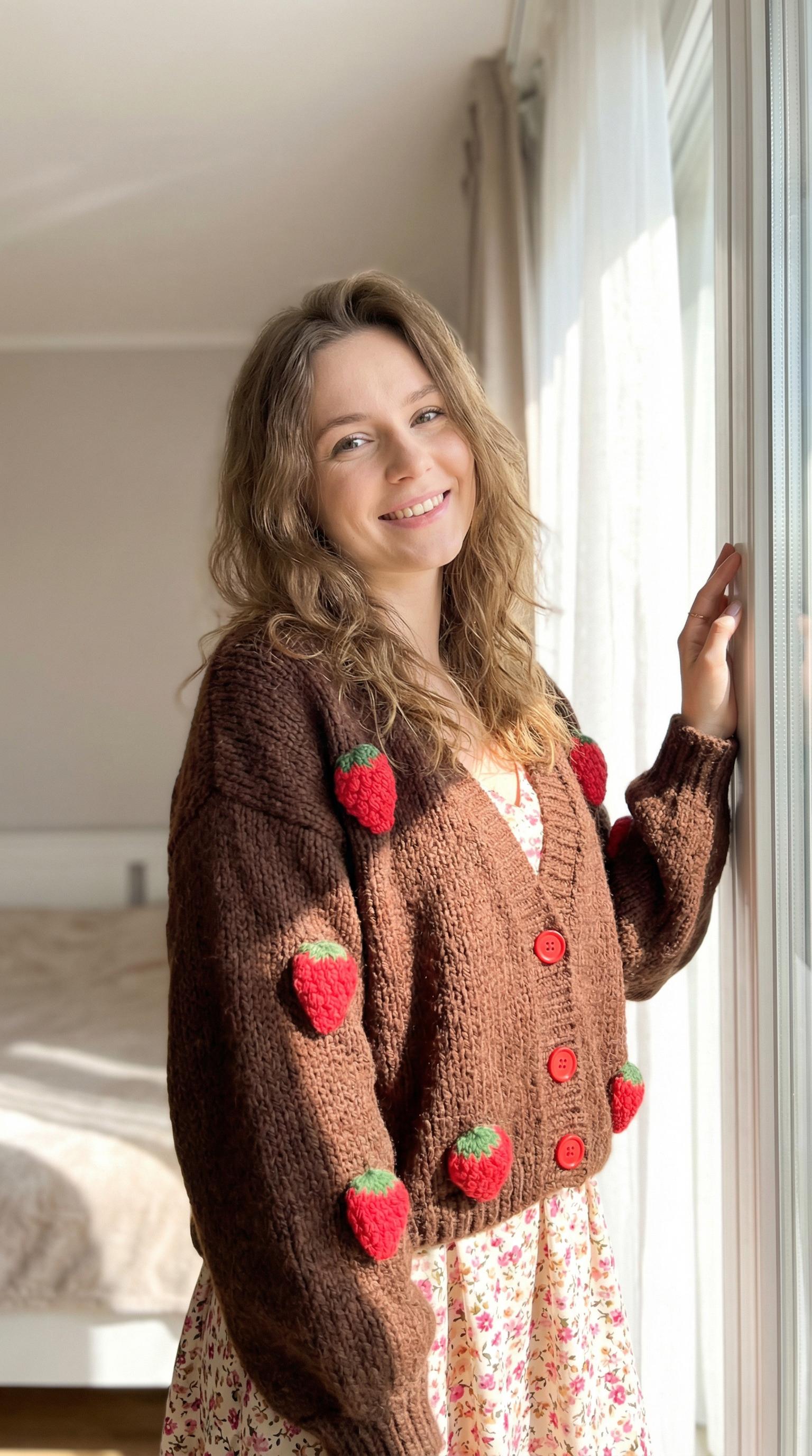 Rozpinany kardigan w eleganckim brązowym odcieniu, ozdobiony dużymi czerwonymi guzikami i wypukłymi aplikacjami w kształcie truskawek, które dodają mu niepowtarzalnego uroku. Luźny, oversize'owy krój i długie, obszerne rękawy zapewniają wygodę i modny wygląd. Dekolt w serek dodaje delikatności, a mieszanka materiałów z wełną i poliamidem sprawia, że sweter jest miękki i przyjemnie ciepły.