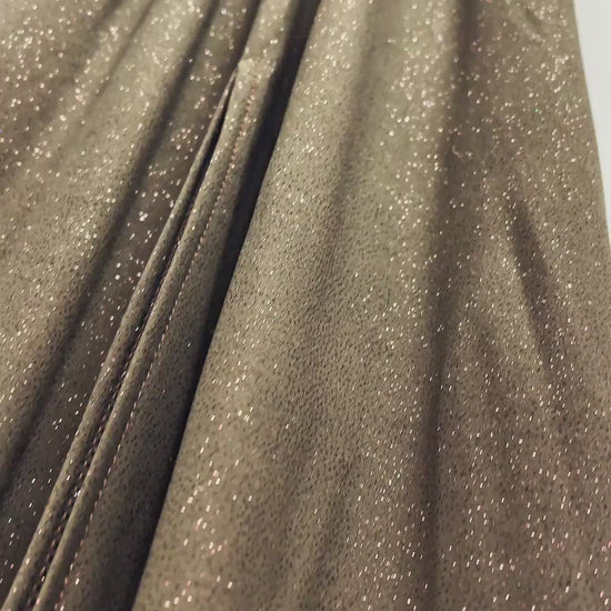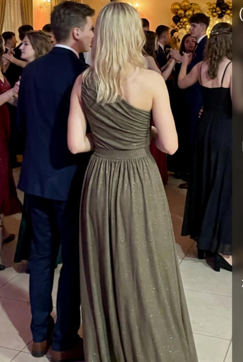 Stylowa sukienka maxi w jasnobrązowym odcieniu wpadającym w khaki to elegancka propozycja na wyjątkowe okazje. Wykonana z elastycznej, brokatowej tkaniny subtelnie mieni się w świetle i zapewnia komfort noszenia. Asymetryczny fason na jedno ramię przyciąga uwagę i podkreśla nowoczesny charakter modelu. Marszczenie na ramieniu dodaje całości lekkości i dekoracyjnego akcentu. Elastyczna guma w talii pięknie zaznacza sylwetkę i dopasowuje się do figury. Rozporek u dołu sukienki nadaje jej zmysłowości oraz swobody ruchów.