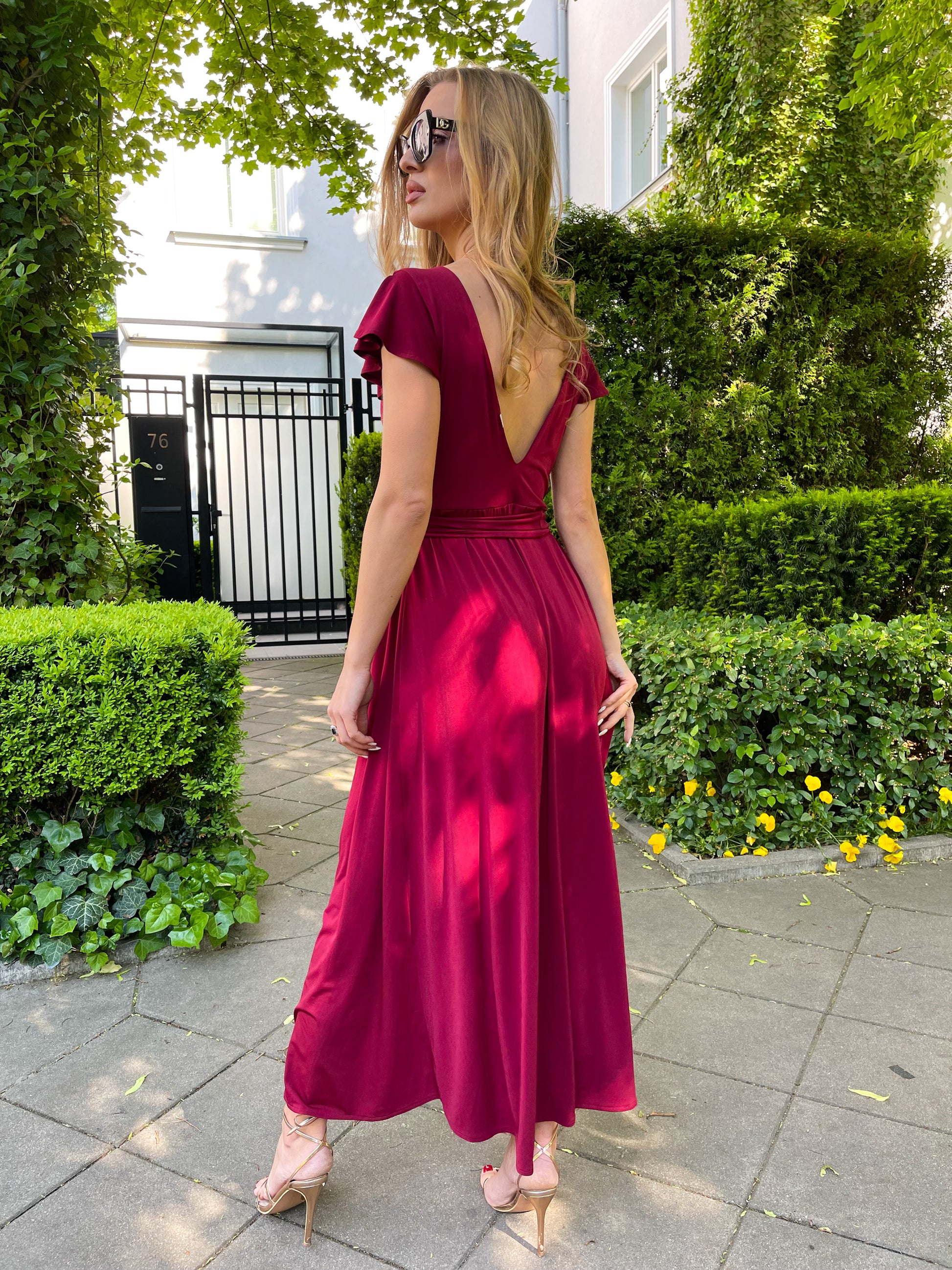 Burgundowa sukienka maxi z falbankami dekoltem na plecach i paskiem id:2011