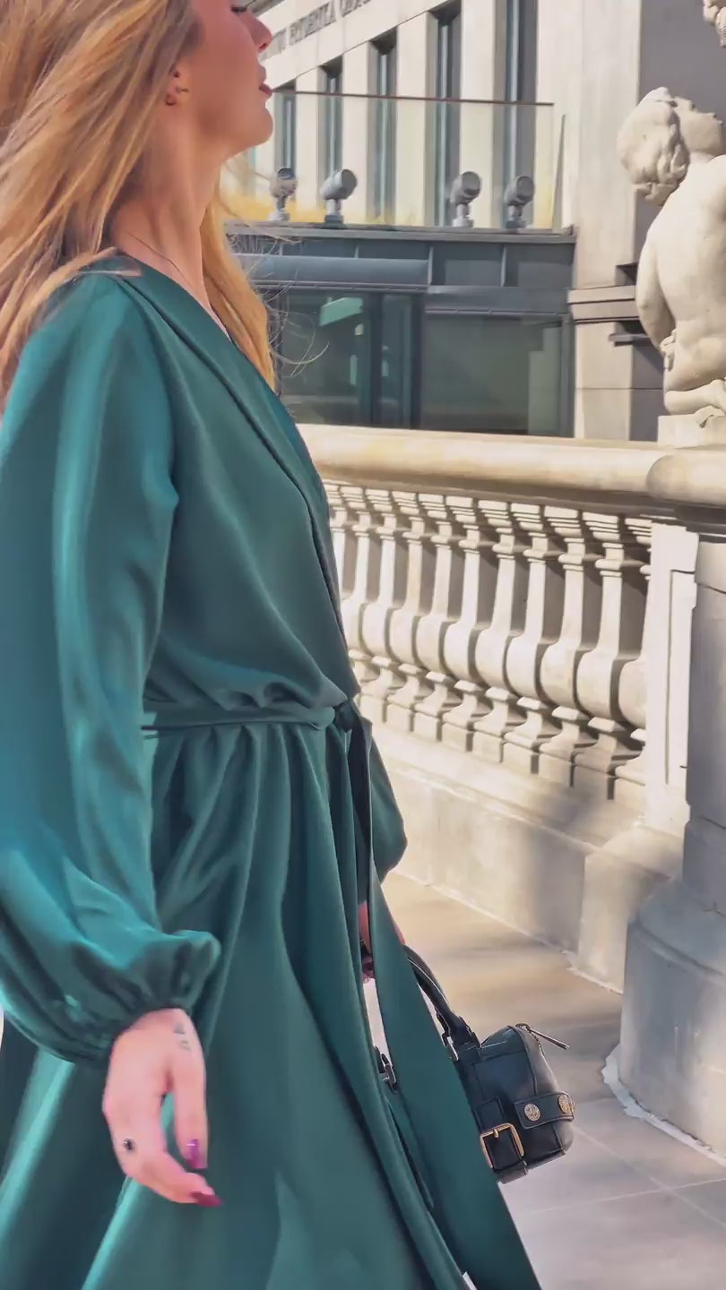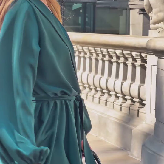 Butelkowo zielona sukienka z satyny o delikatnym połysku to doskonały wybór na wyjątkowe wyjścia. Rozkloszowany fason do kolan nadaje lekkości, a kopertowy dekolt na zakładkę subtelnie eksponuje linię szyi. Gumka w talii wraz z paskiem w zestawie podkreślają sylwetkę, zapewniając jednocześnie komfort noszenia. Długie bufiaste rękawy zakończone gumką można swobodnie podwijać. Uszyta w Polsce, dostępna w rozmiarach XS–2XL, świetnie sprawdzi się na studniówkę, świąteczną kolację czy karnawałowe party w eleganckim klubie.