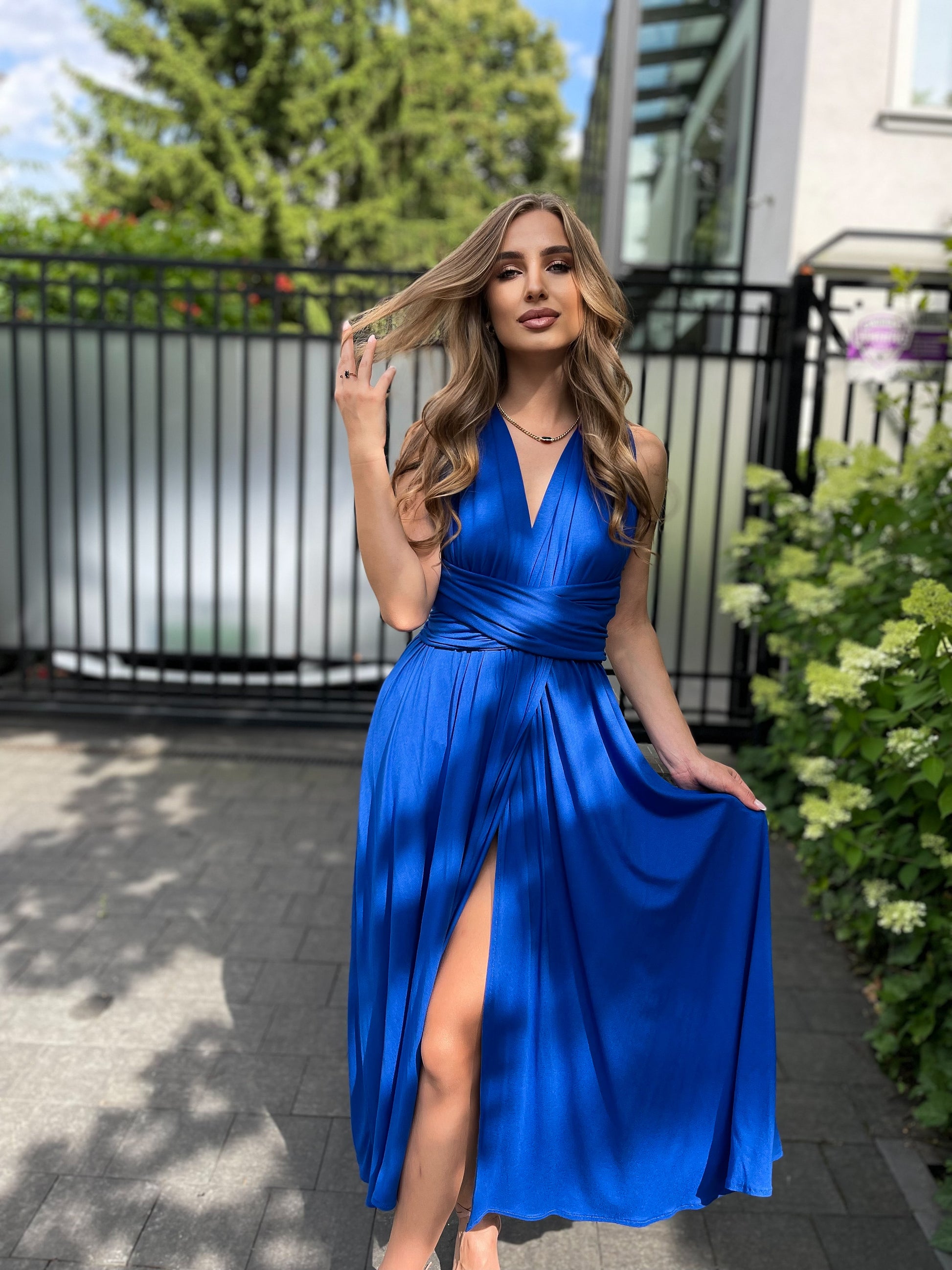 Zachwycaj w tej kobaltowej sukience midi do połowy łydki, wykonanej z elastycznej dzianiny wiskozowej o matowym wykończeniu. Jej infinity design pozwala na wiązanie na wiele sposobów, dzięki czemu możesz dostosować stylizację do swoich potrzeb i sylwetki. Gumka w pasie podkreśla talię, zapewniając jednocześnie wygodę noszenia. Ta wieczorowa sukienka to idealny wybór na wesela, zarówno dla druhen, jak i gości, a także na eleganckie bale czy uroczyste przyjęcia, łącząc intensywny kolor z uniwersalnym krojem.