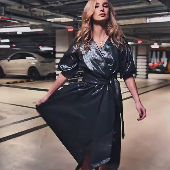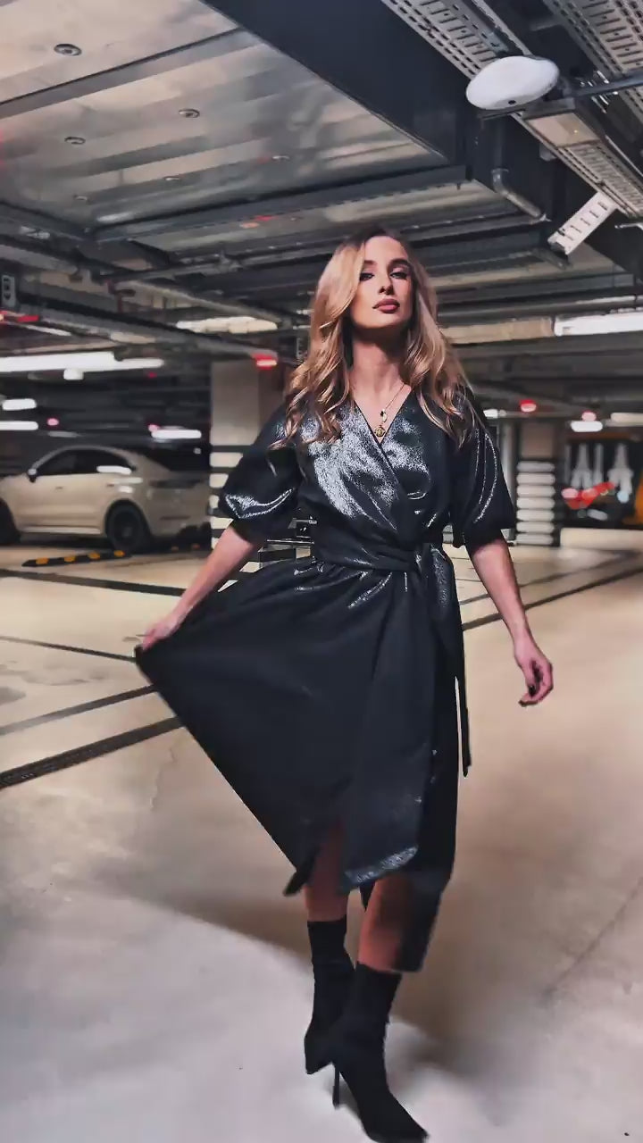 Sukienka midi w odcieniu turkusowym z subtelnym, wtopionym brokatem to romantyczna i świeża propozycja na letnie uroczystości. Zwiewny, rozkloszowany krój z delikatnym rozcięciem na nodze nadaje lekkości i swobody ruchu, a elastyczna talia z szerokim pasem pięknie podkreśla sylwetkę. Kopertowy dekolt w kształcie litery V dodaje elegancji, a krótkie, bufiaste rękawy wprowadzają dziewczęcy akcent.