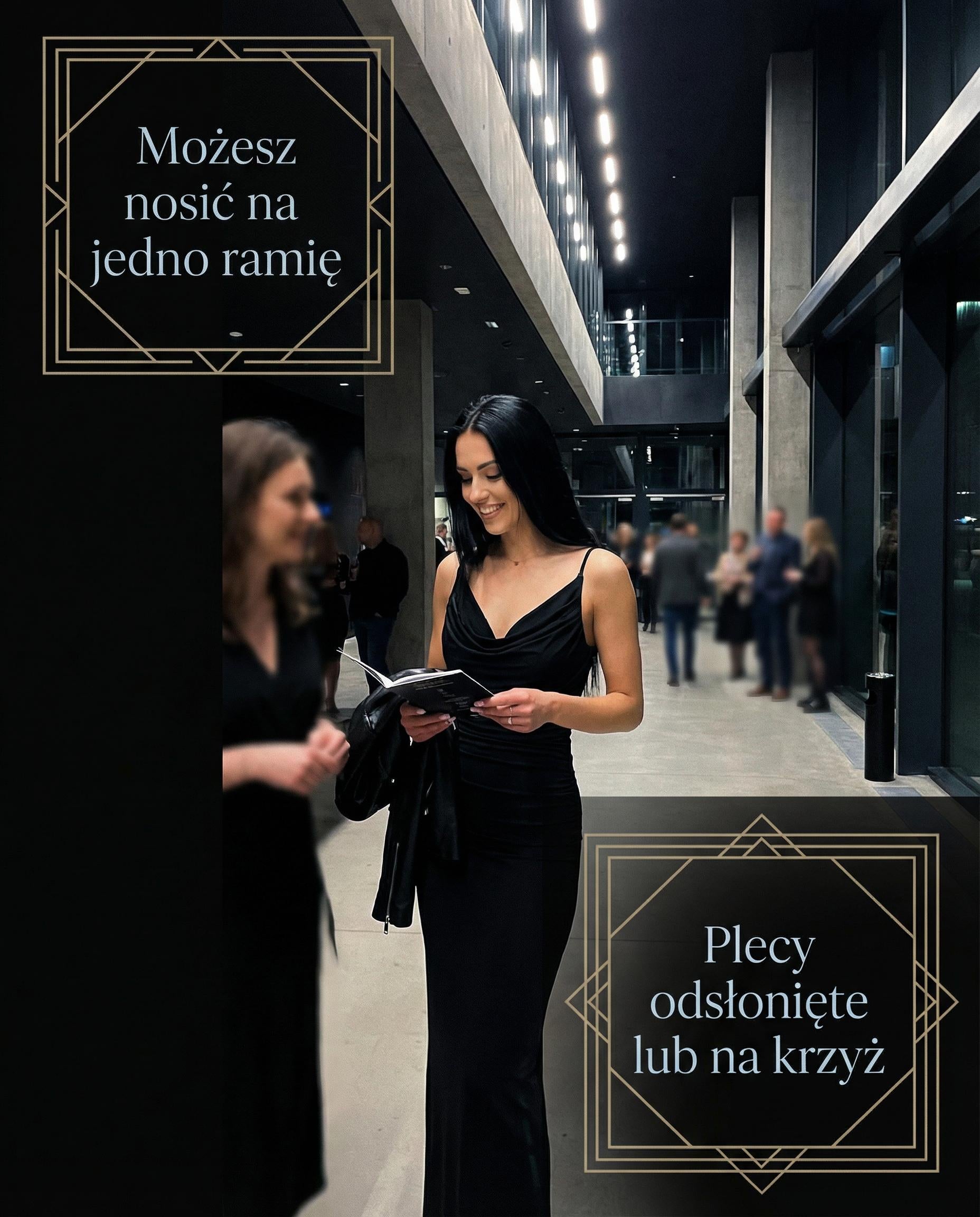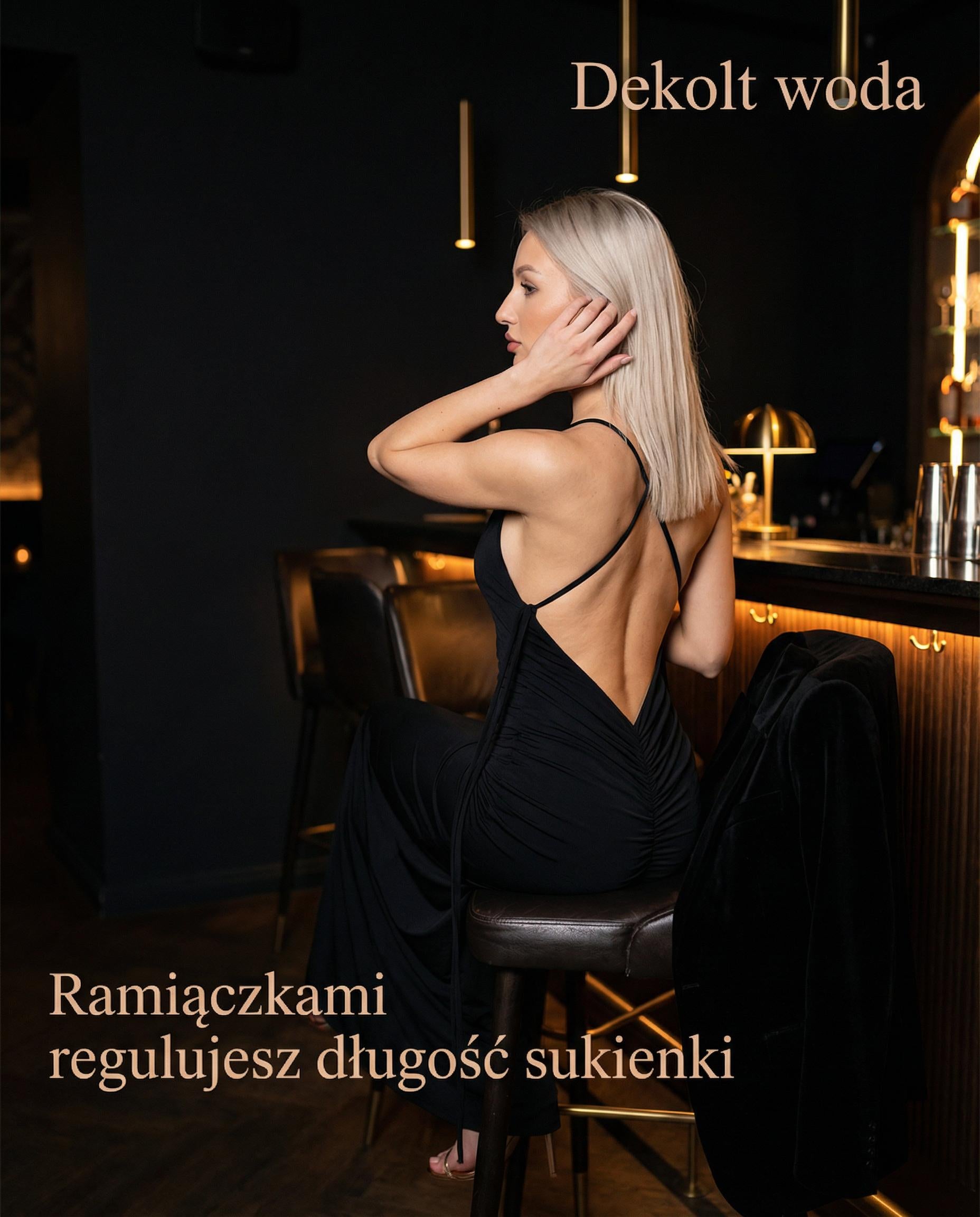 Czarna sukienka maxi to klasyka w najlepszym wydaniu, która łączy elegancję z nutą zmysłowości. Wykonana z podwójnej elastycznej tkaniny, dopasowuje się do sylwetki, pięknie podkreślając jej linie. Głęboko odkryte plecy i subtelne marszczenie na pośladkach to detale, które przyciągają wzrok i dodają kreacji charakteru. Dekolt woda z przodu delikatnie opływa sylwetkę, nadając jej szyku, a długie, smukłe ramiączka nie tylko stabilizują sukienkę, ale też zachwycają swoją formą – zwisają lekko i poruszają się w tańcu, tworząc efekt pełen wdzięku.