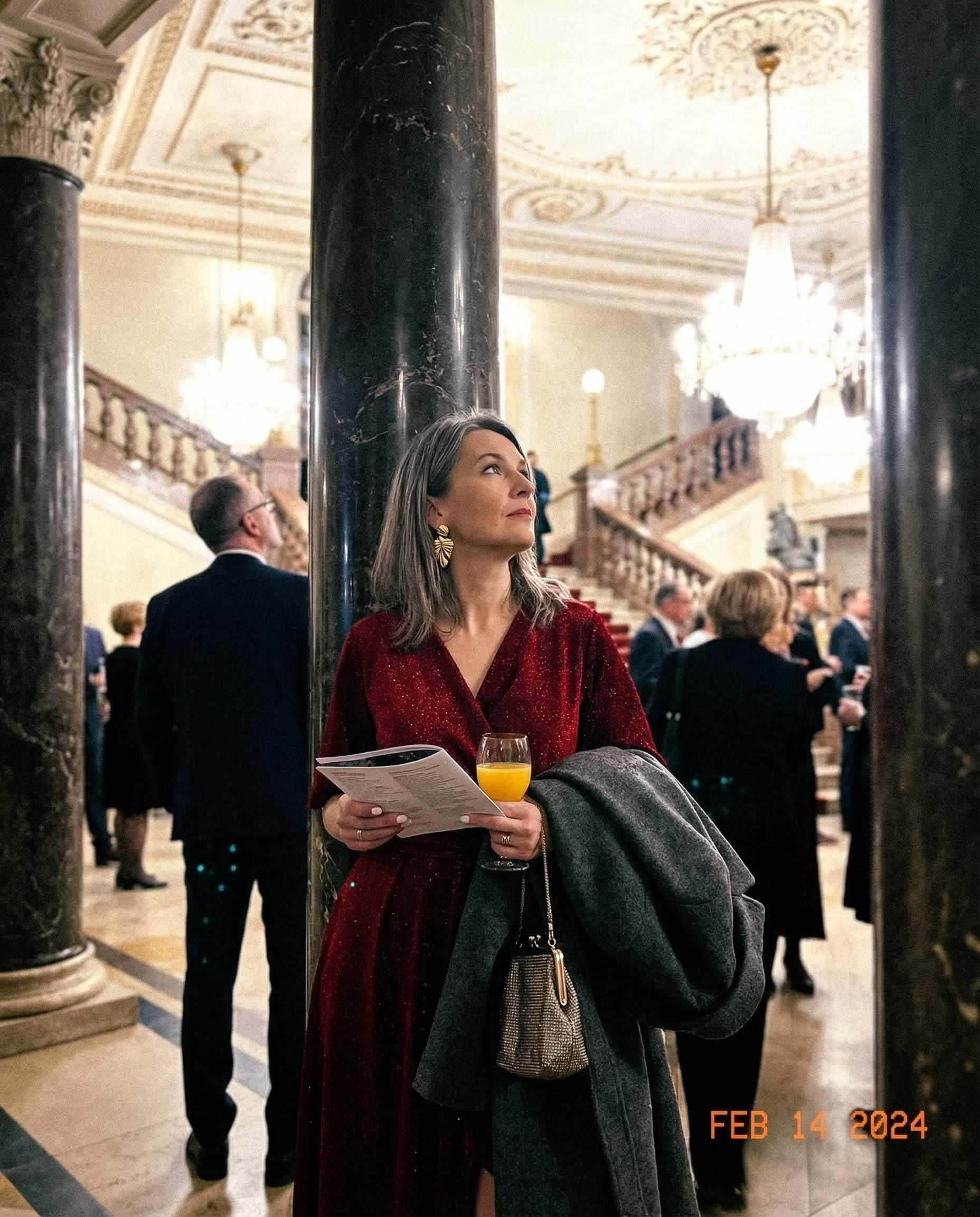 Czarna sukienka midi z czerwoną błyszczącą nitką, która subtelnie nadaje jej połysku, to kwintesencja elegancji i kobiecości. Rozkloszowany dół z rozcięciem na nogę zapewnia swobodę ruchów, a gumka w talii i szeroki pas pięknie modelują sylwetkę. Dekolt na zakładkę w kopertowym stylu podkreśla szyję i dekolt, a krótkie bufiaste rękawy dodają kreacji lekkości i wdzięku.