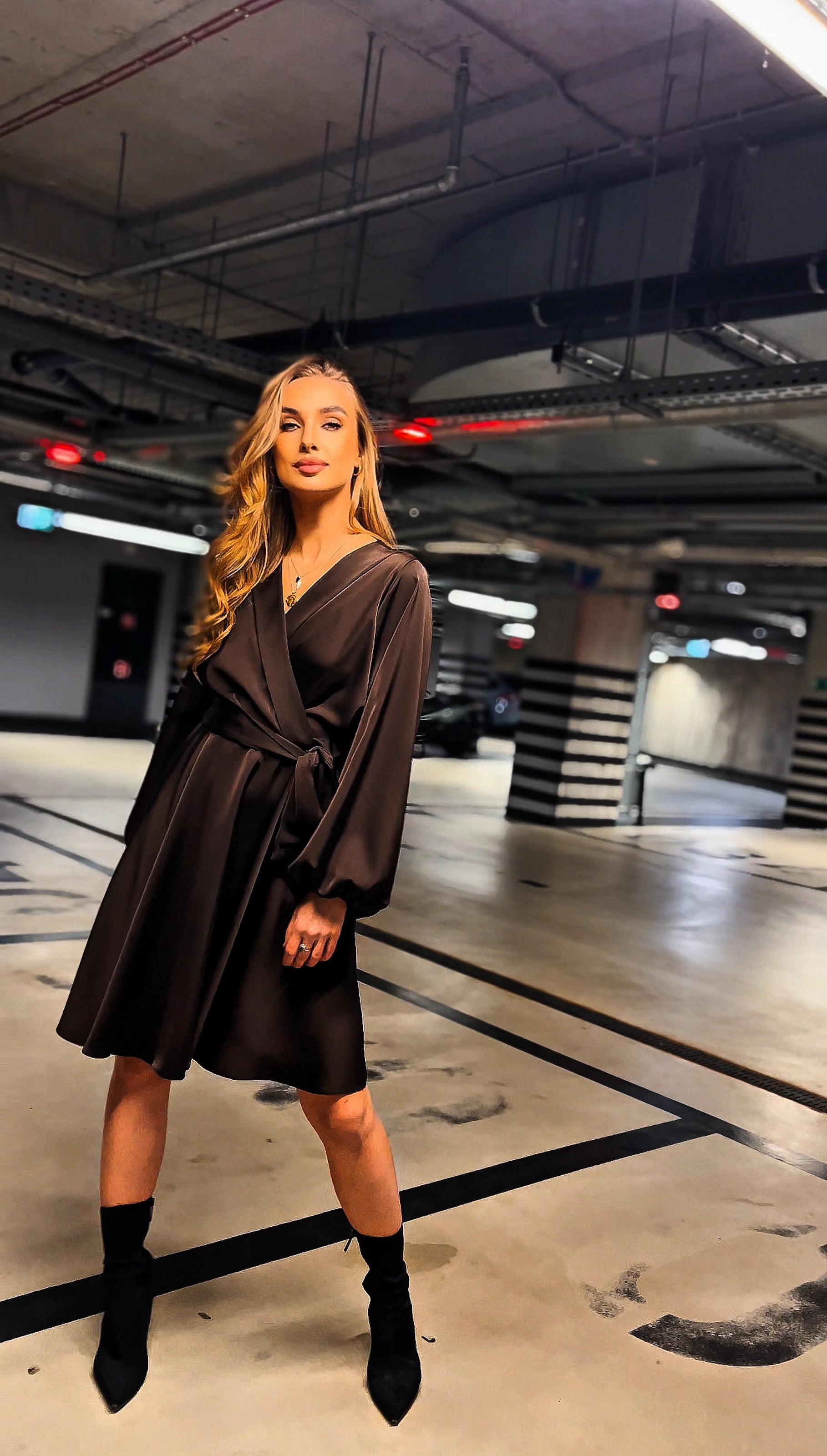 Sukienka w kolorze ciemnej czekolady z satyny o delikatnym połysku to idealny wybór na eleganckie okazje. Rozkloszowany fason do kolan nadaje jej lekkości i kobiecego wdzięku, a kopertowy dekolt pięknie podkreśla linię szyi oraz dekolt. W talii wszyta gumka i dołączony pasek akcentują figurę, gwarantując przy tym wygodę noszenia przez cały wieczór. Długie, lekko bufiaste rękawy zakończone gumką można swobodnie układać według preferencji. Uszyta w Polsce z dbałością o detale, dostępna w rozmiarach XS–2XL, sprawdzi się doskonale na przyjęcie, kolację świąteczną lub karnawałowy wieczór w eleganckim wydaniu.