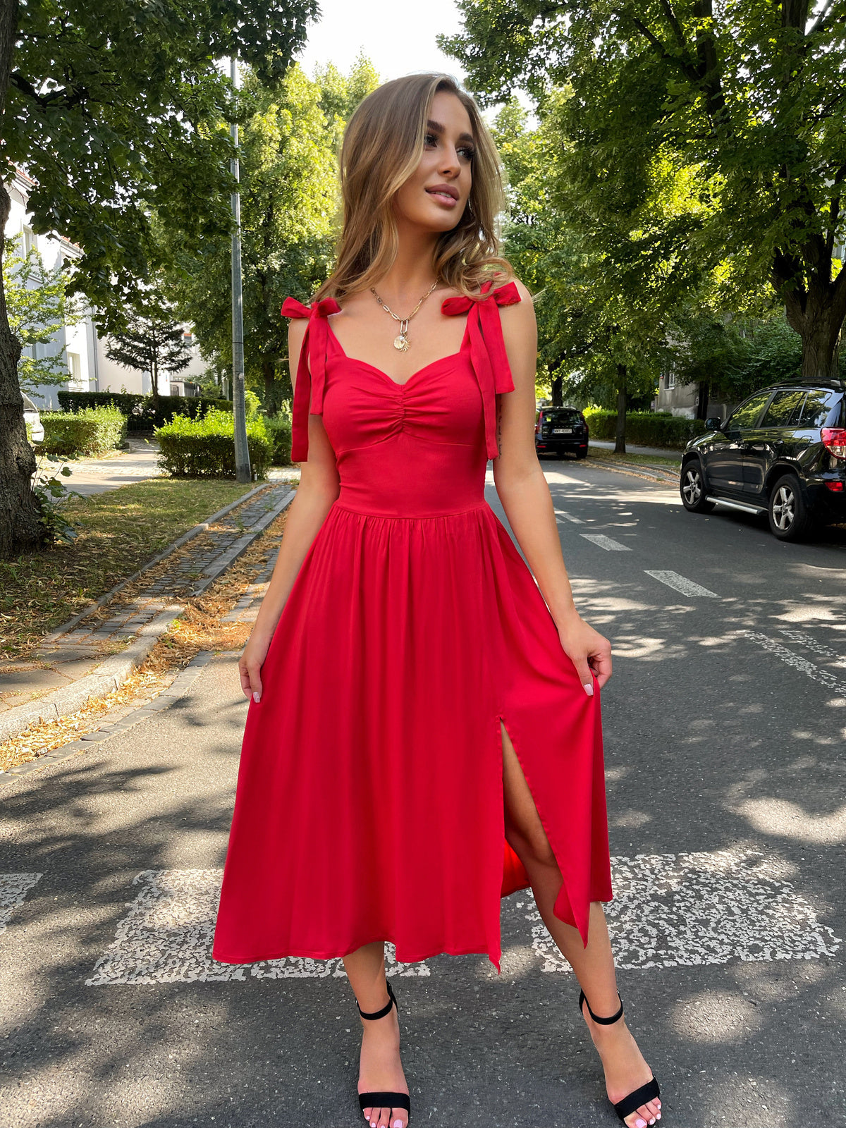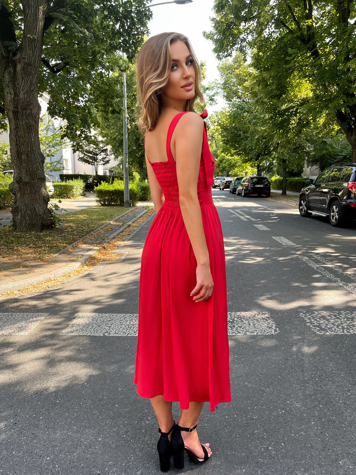 Zmysłowa, elegancka i pełna wdzięku – czerwona sukienka midi to idealny wybór na wyjątkowe okazje. Wykonana z lekkiej, naturalnej wiskozy, pięknie układa się na sylwetce i zapewnia komfort noszenia. Ramiączka do wiązania pozwalają regulować długość sukienki i tworzyć subtelne kokardki, dodając romantycznego akcentu. Dekolt w kształcie serduszka z marszczeniem na biuście podkreśla sylwetkę, a odcięcie pod biustem nadaje całości lekkości. Elastyczny ściągacz na plecach sprawia, że sukienka dopasowuje się do figury, a rozcięcie na nodze do połowy uda dodaje subtelnej zmysłowości, zachowując przy tym elegancję.