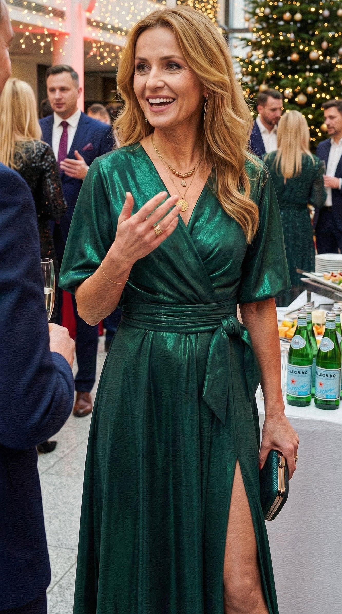 Sukienka midi w odcieniu turkusowym z subtelnym, wtopionym brokatem to romantyczna i świeża propozycja na letnie uroczystości. Zwiewny, rozkloszowany krój z delikatnym rozcięciem na nodze nadaje lekkości i swobody ruchu, a elastyczna talia z szerokim pasem pięknie podkreśla sylwetkę. Kopertowy dekolt w kształcie litery V dodaje elegancji, a krótkie, bufiaste rękawy wprowadzają dziewczęcy akcent.