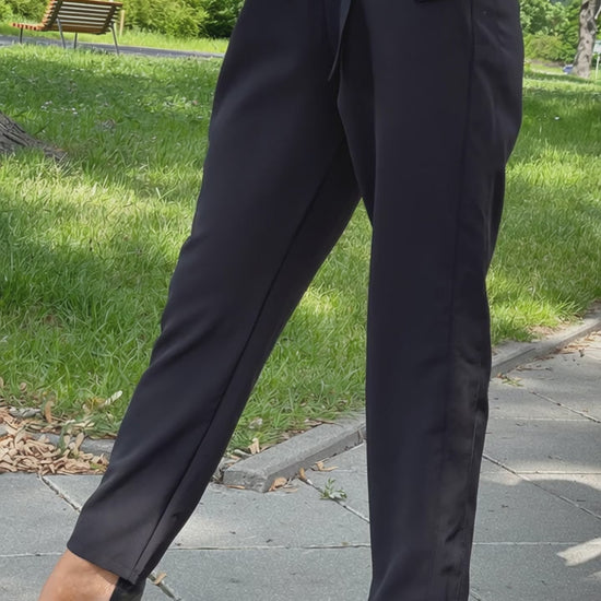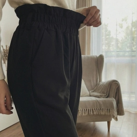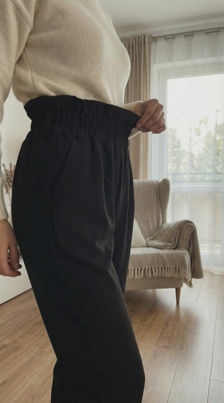 Te stylowe spodnie o fasonie paperbag to idealne połączenie elegancji i nowoczesnego szyku, które perfekcyjnie modeluje sylwetkę. Charakterystyczny wysoki stan wykończony ozdobną falbanką oraz wiązany pasek w talii efektownie podkreślają kobiece kształty, nadając każdej stylizacji wyjątkowego charakteru. Wykonane z gładkiego, lekko elastycznego materiału w głębokiej czerni, zapewniają komfort noszenia przez cały dzień, jednocześnie zachowując nienaganny fason. Nogawki o klasycznym, lekko zwężanym kroju świetnie komponują się zarówno ze szpilkami, jak i z bardziej casualowym obuwiem. Praktyczne, wsuwane kieszenie boczne dodają modelowi funkcjonalności, czyniąc go doskonałym wyborem do biura, na spotkania biznesowe czy wieczorne wyjścia.