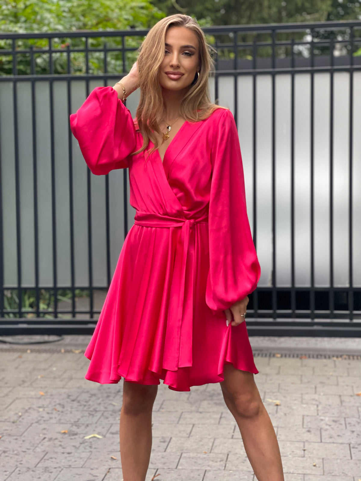 Ta satynowa sukienka w pastelowym różu z nutą fuksji to kwintesencja dziewczęcej elegancji i subtelnego blasku. Rozkloszowana spódnica z pełnego koła delikatnie układa się w ruchu, tworząc efekt lekkości i wdzięku. Wykonana z błyszczącej satyny z wiskozy, jest przyjemna w dotyku i idealna na wyjątkowe okazje. Gumka w talii, szeroki pasek oraz dekolt kopertowy na zakładkę podkreślają sylwetkę, a bufiaste długie rękawy zakończone gumką dodają całości wyrafinowanego stylu.
