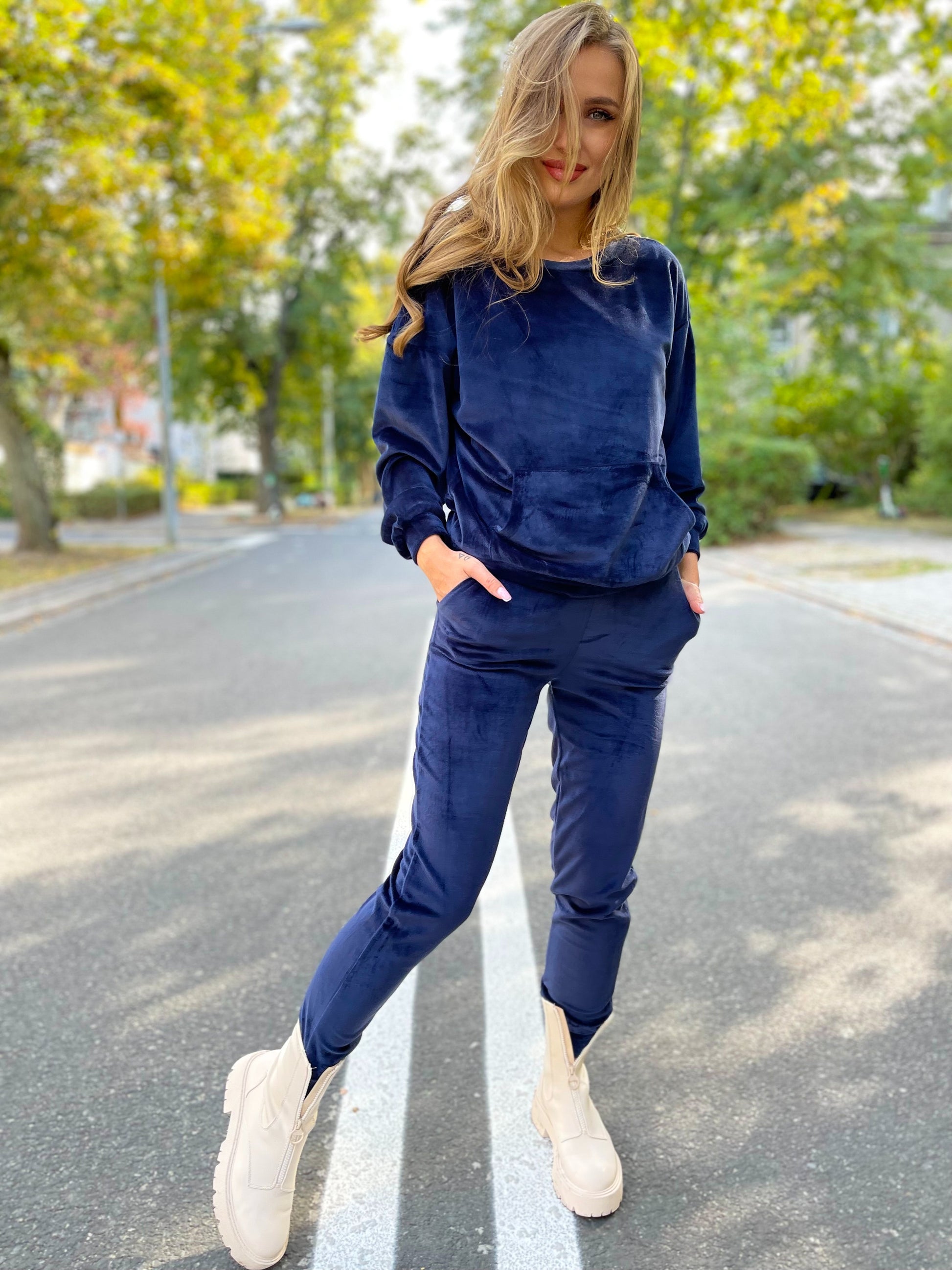 Granatowy Welurowy komplet dresowy z bluzą kangurką id:736