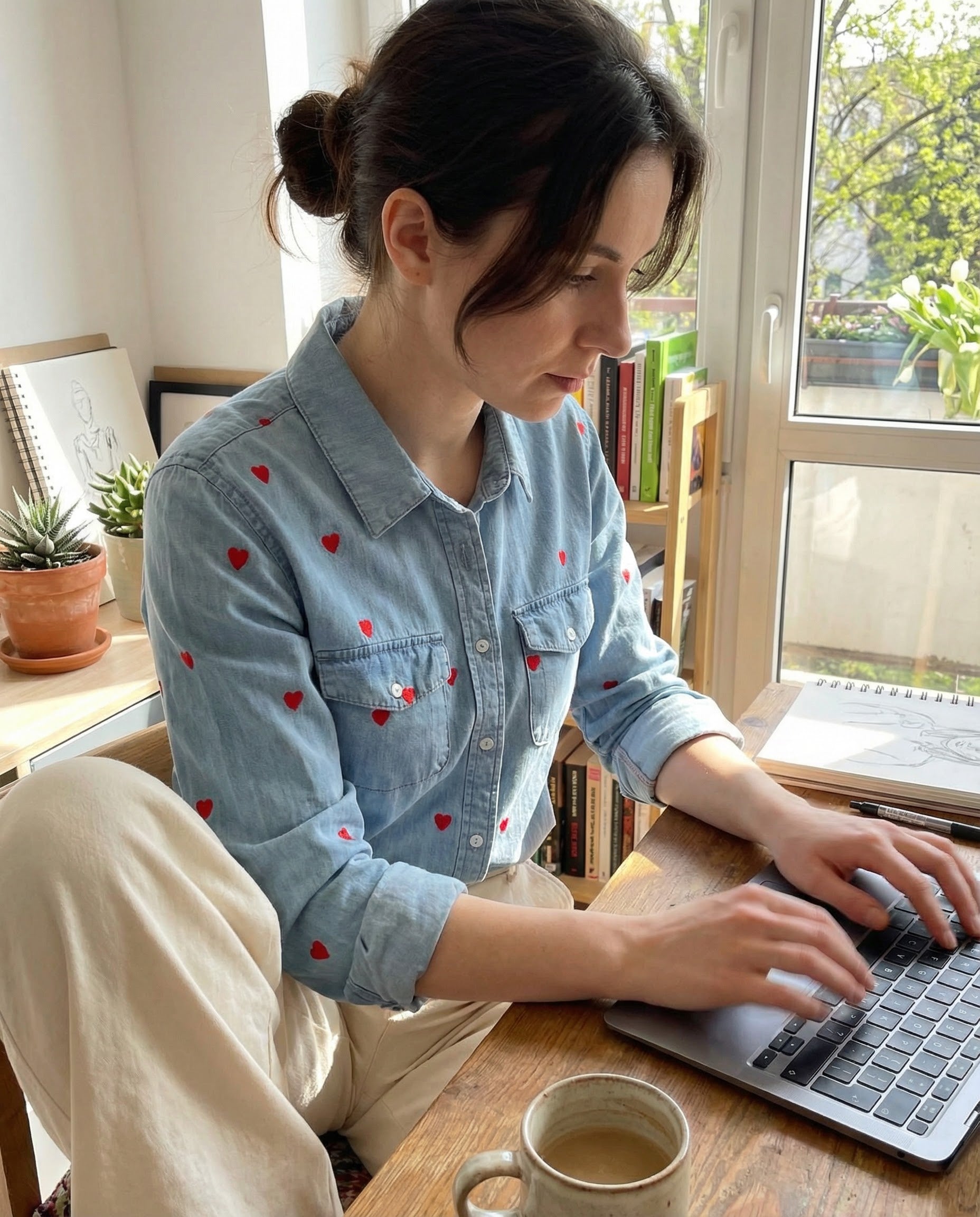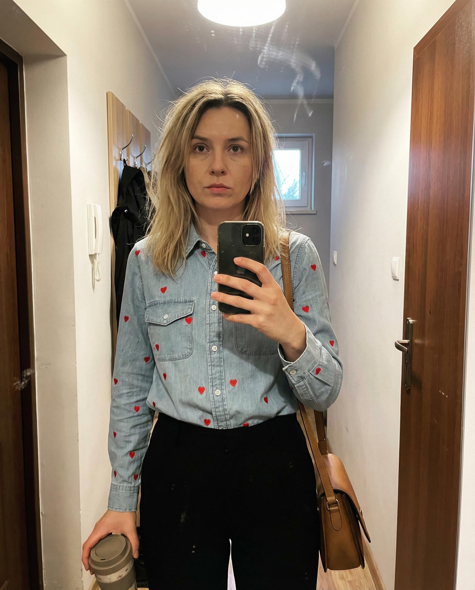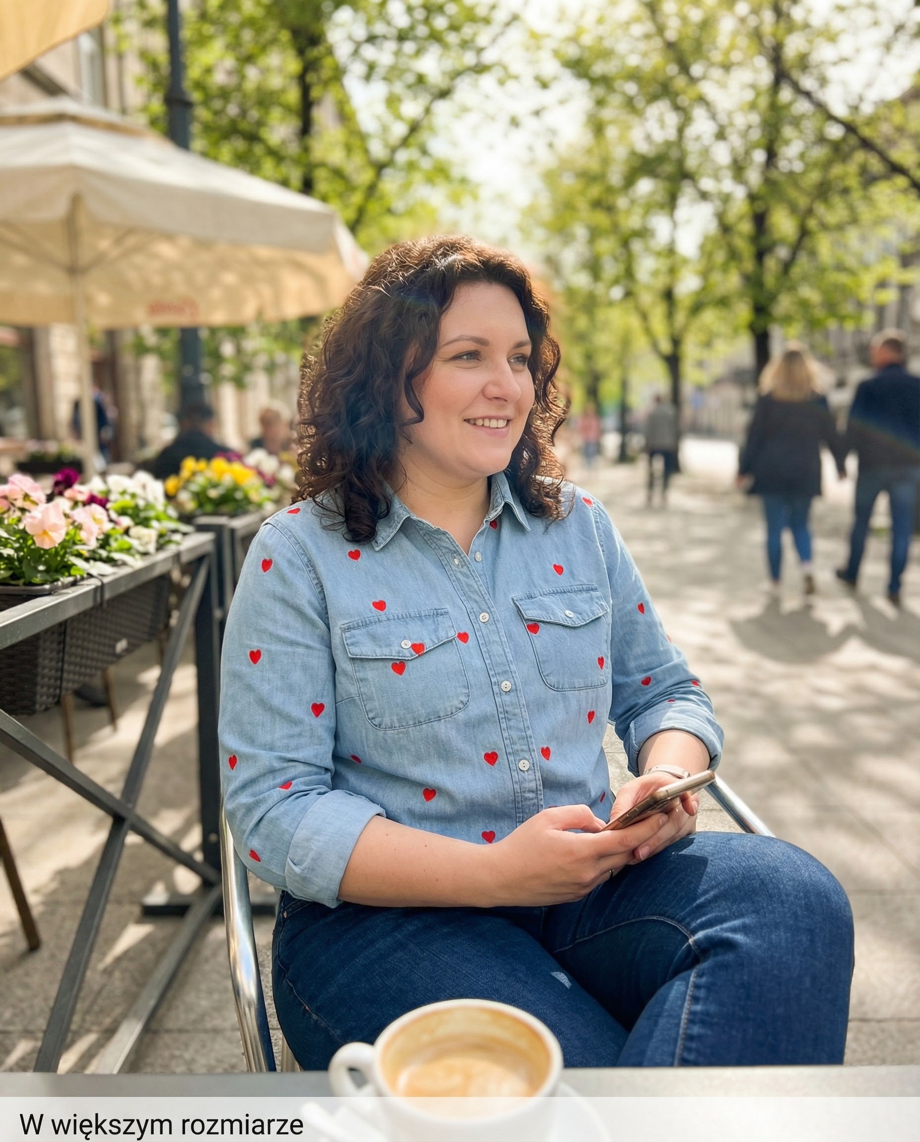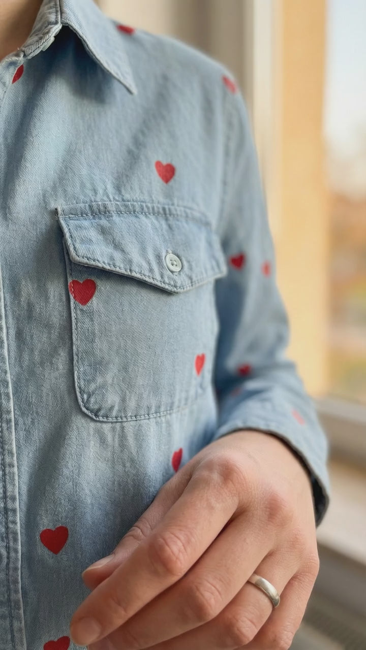 Ta wyjątkowa koszula to idealne połączenie klasycznego jeansowego stylu z uroczym, romantycznym akcentem. Wykonana z miękkiego, jasnego denimu, zapewnia komfort noszenia przez cały dzień, jednocześnie zachowując swoją strukturę. Całość powierzchni została ozdobiona drobnymi, kontrastującymi haftami w kształcie serduszek, które nadają jej unikalnego i radosnego charakteru. Klasyczny kołnierzyk oraz dwie funkcjonalne kieszenie na piersi nawiązują do tradycyjnej mody użytkowej, tworząc ciekawy kontrast z delikatnym wzorem. Dzięki regularnemu krojowi koszula świetnie prezentuje się zarówno wpuszczona w spodnie, jak i noszona luźno jako lekka narzutka. To doskonały wybór dla osób, które chcą dodać odrobinę fantazji do swoich codziennych, casualowych stylizacji.