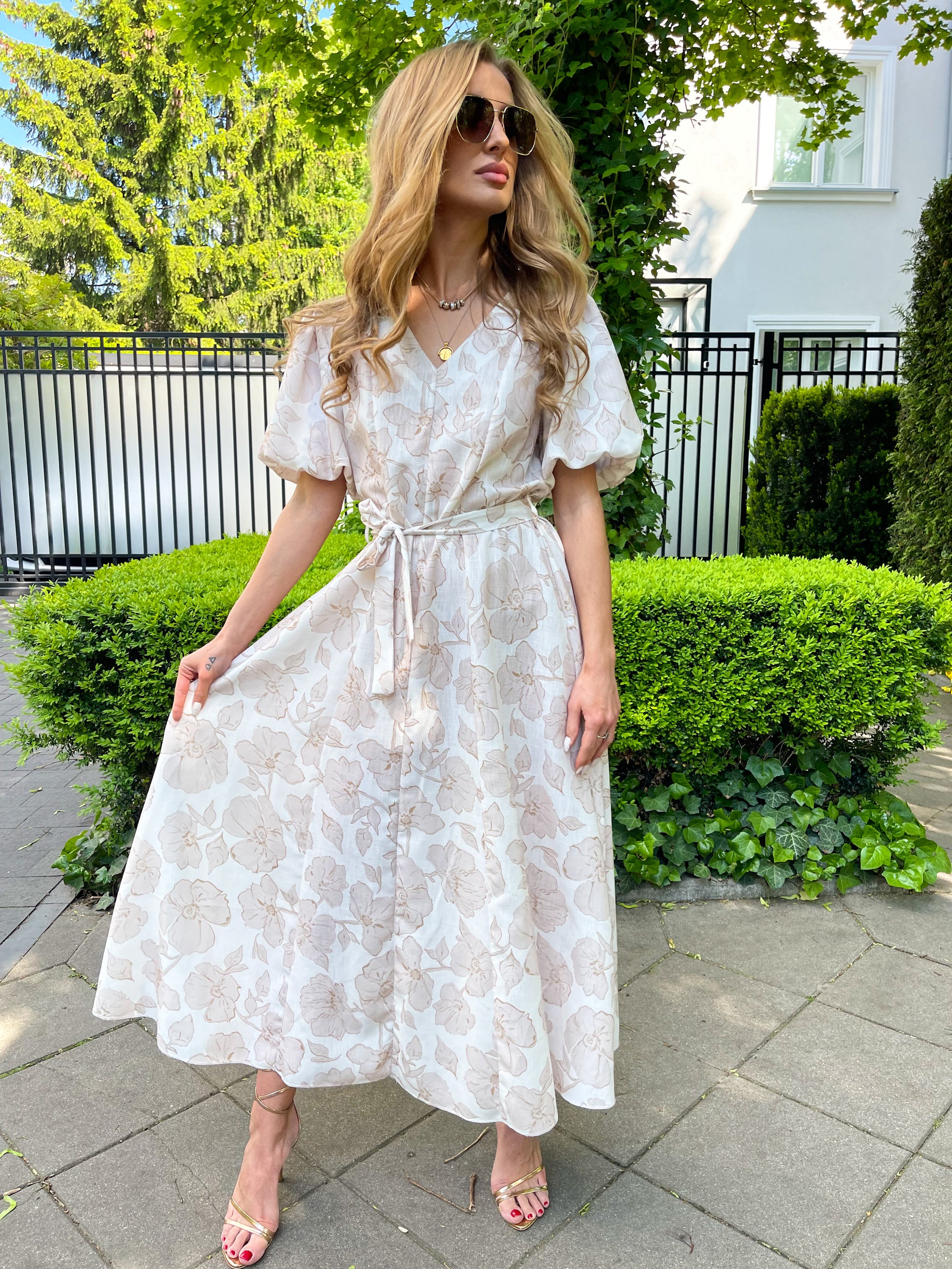 Kremowa sukienka na wesele midi w beżowe kwiaty rozkloszowana z bufkami id:2064