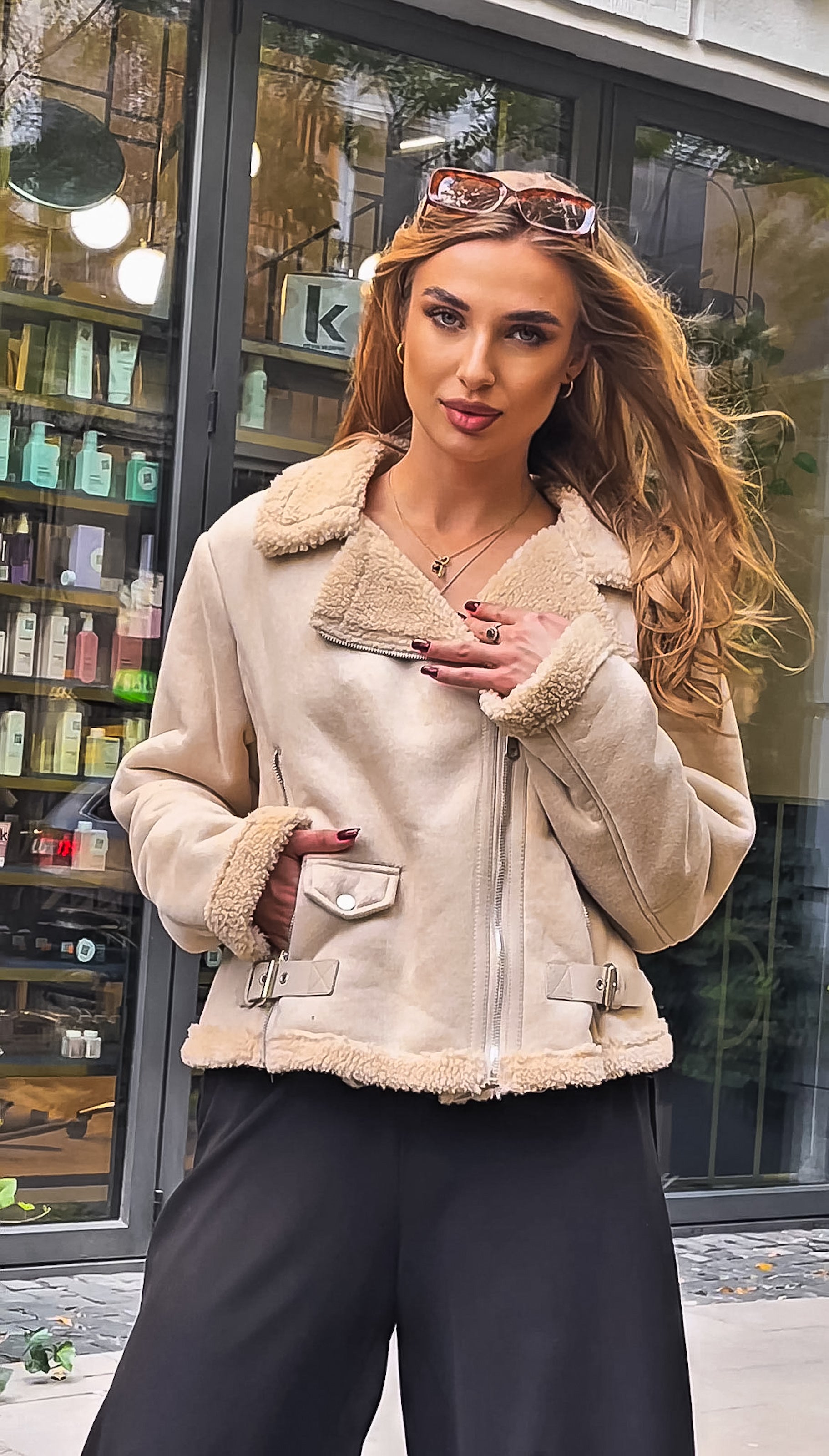 Krótka kurtka z kożuszkiem z imitacji zamszu w kolorze beżowym id:2245