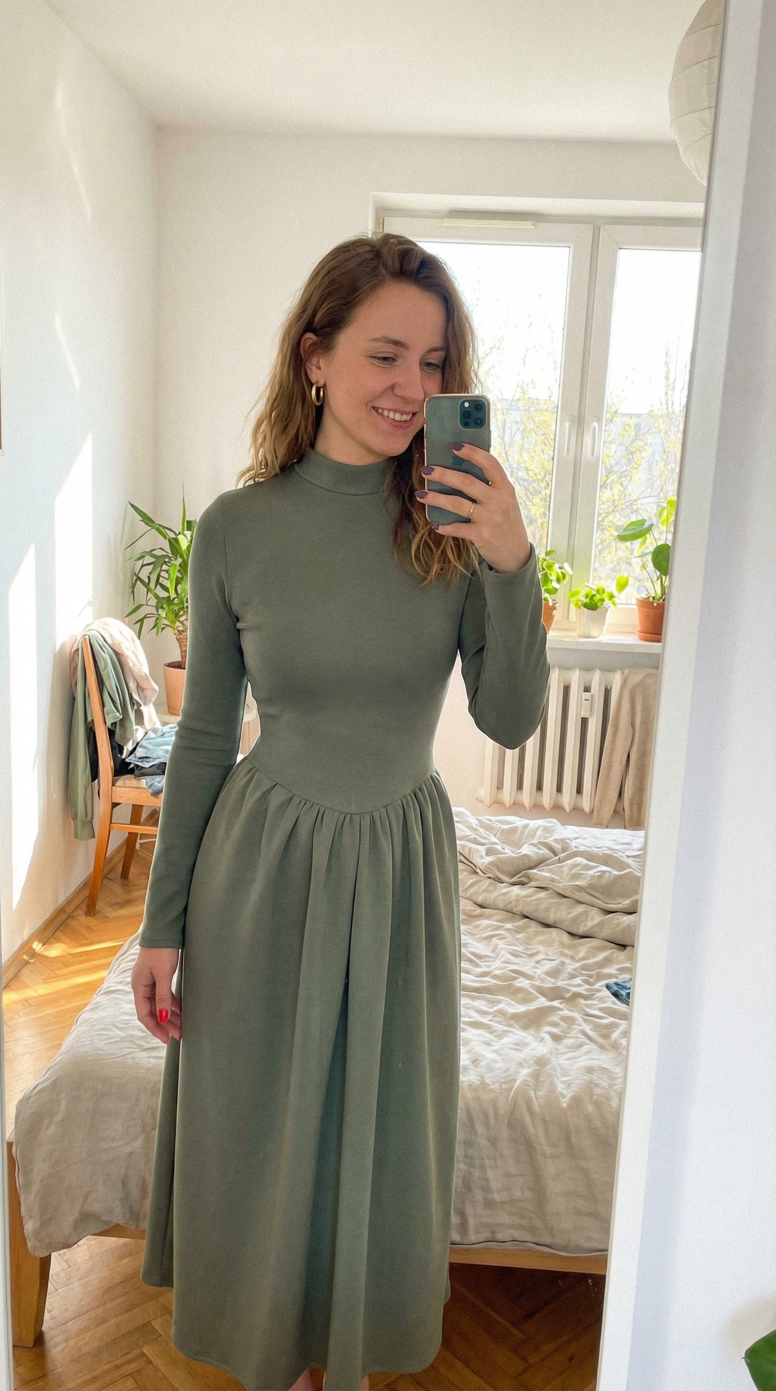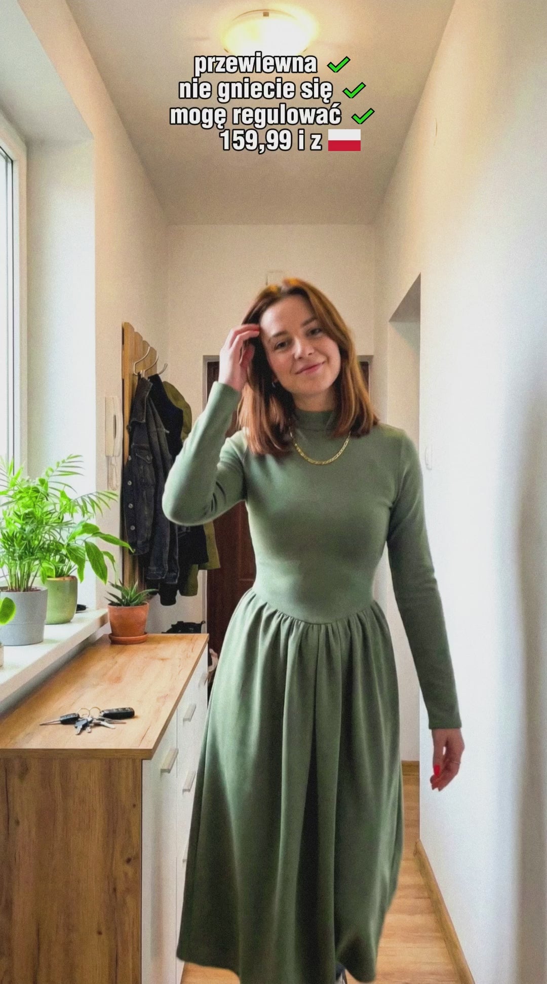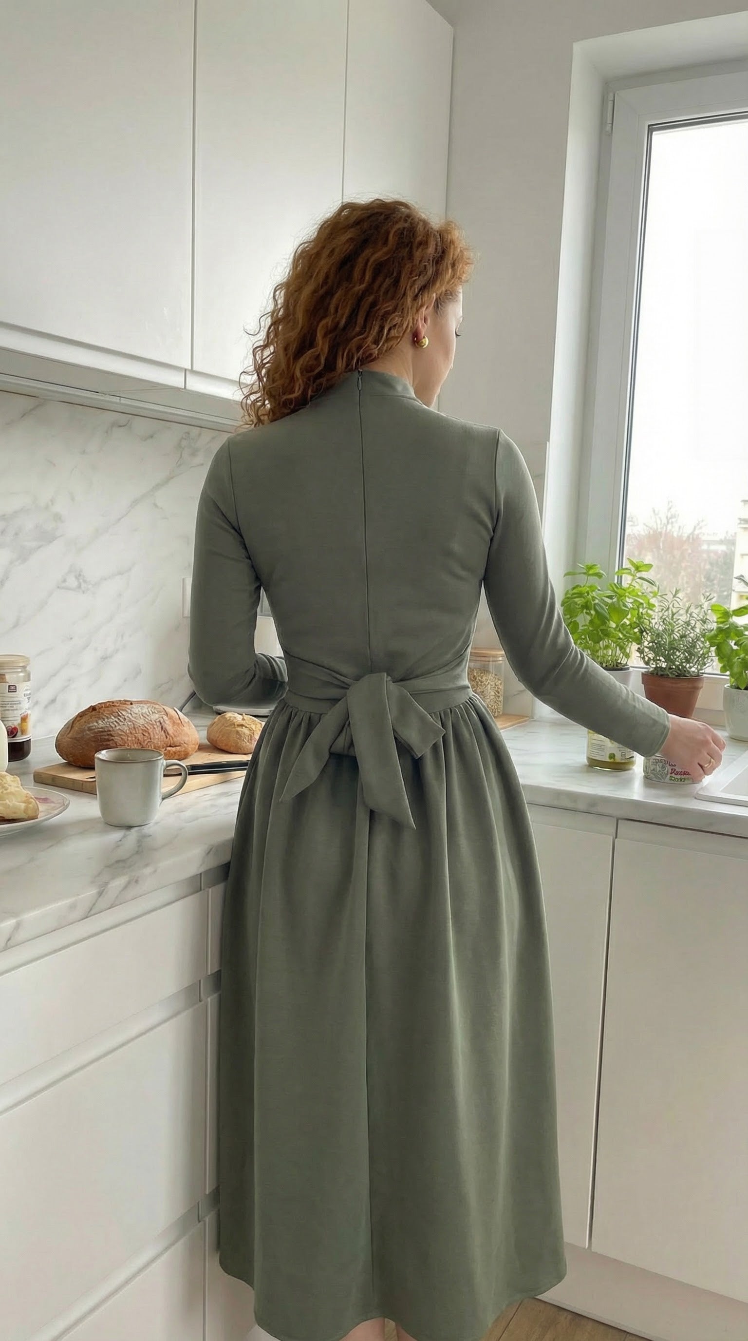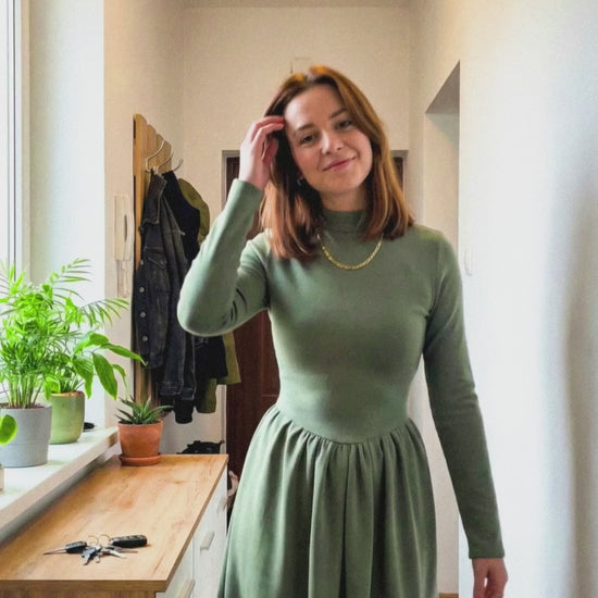 Klasyczna sukienka midi w kolorze szlachetnej oliwki to wyrafinowana propozycja, która wnosi powiew świeżości do kobiecej szafy. Dopasowana góra subtelnie zaznacza linię biustu, podczas gdy lekko rozkloszowany dół nadaje sylwetce lekkości i wdzięku przy każdym kroku. Stylowa stójka stanowi nowoczesny akcent, który w połączeniu z długim rękawem tworzy harmonijną całość na chłodniejsze dni. Zastosowaliśmy miękki, elastyczny materiał, dzięki któremu noszenie tej sukienki przez wiele godzin staje się czystą przyjemnością. Wyraźnie zaznaczona talia wspaniale modeluje proporcje figury, nadając jej pożądany kształt klepsydry. Głęboka, ziemista zieleń oliwki idealnie komponuje się zarówno ze złotą biżuterią, jak i z naturalnymi, skórzanymi dodatkami. To model stworzony dla kobiet ceniących minimalistyczny design, który z łatwością adaptuje się do biurowego dress code’u oraz weekendowych wyjść.