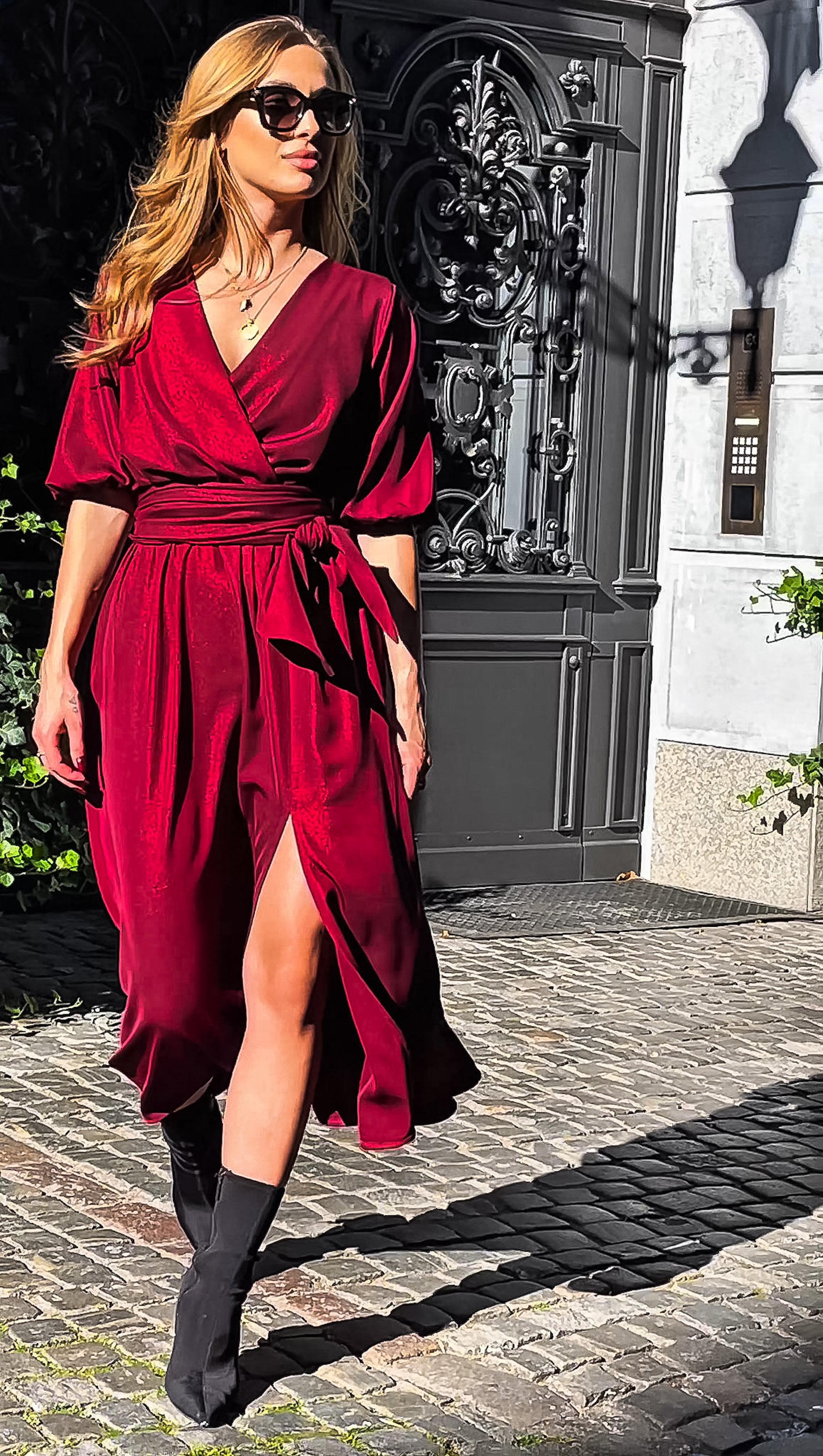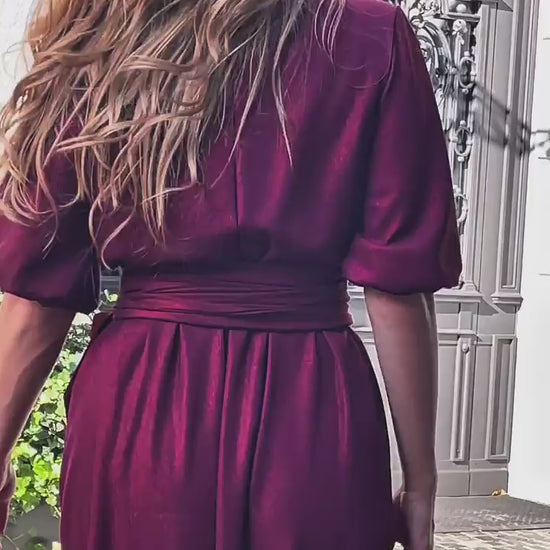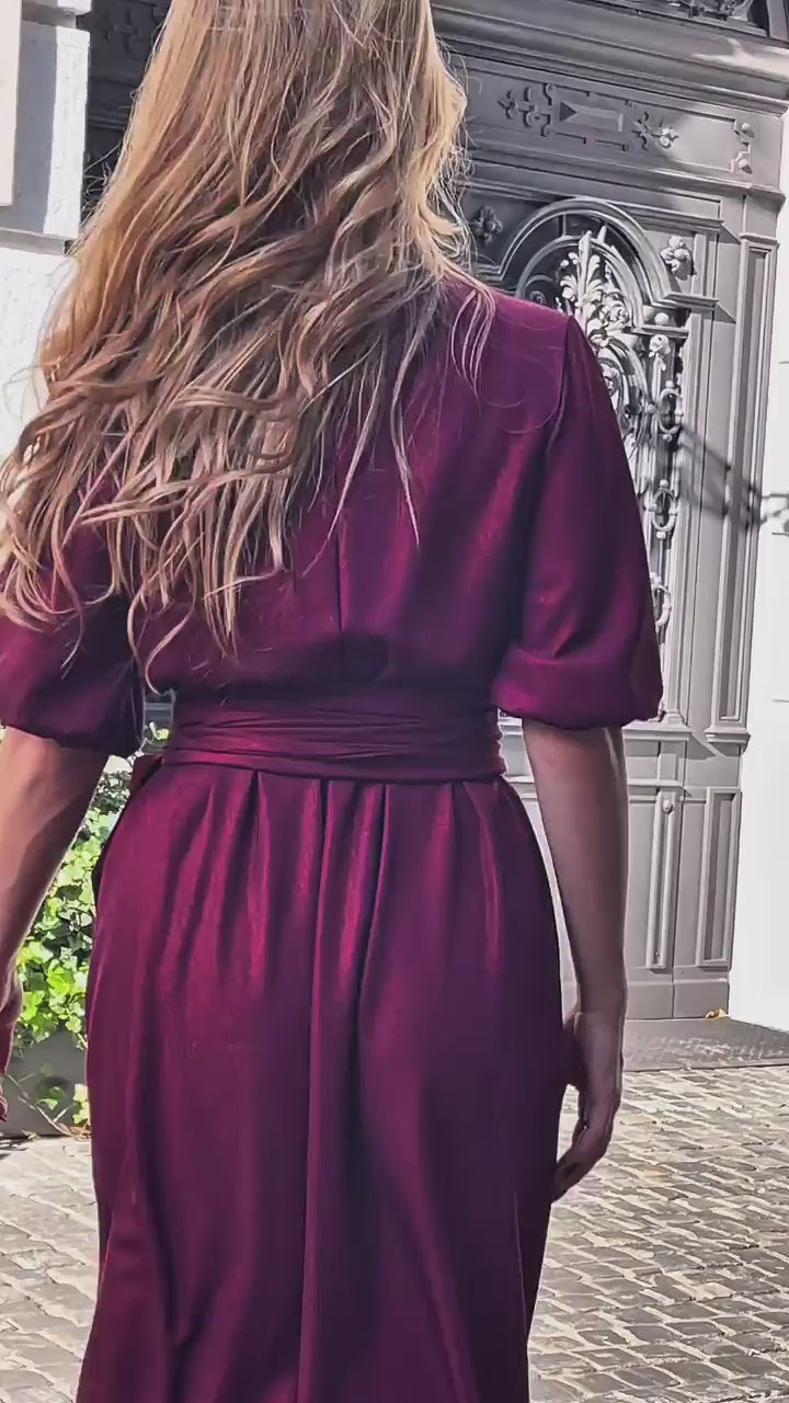 Sukienka midi w szałwiowym odcieniu z delikatnym brokatowym połyskiem to wyjątkowe połączenie elegancji i nowoczesności. Rozkloszowany krój z efektownym rozcięciem na nodze subtelnie wysmukla sylwetkę i dodaje jej lekkości. Talia z elastyczną gumką oraz szerokim pasem pięknie podkreśla figurę, a kopertowy dekolt w kształcie litery V nadaje całości szyku i kobiecego uroku. Krótkie bufiaste rękawy wprowadzają romantyczny, dziewczęcy detal.
