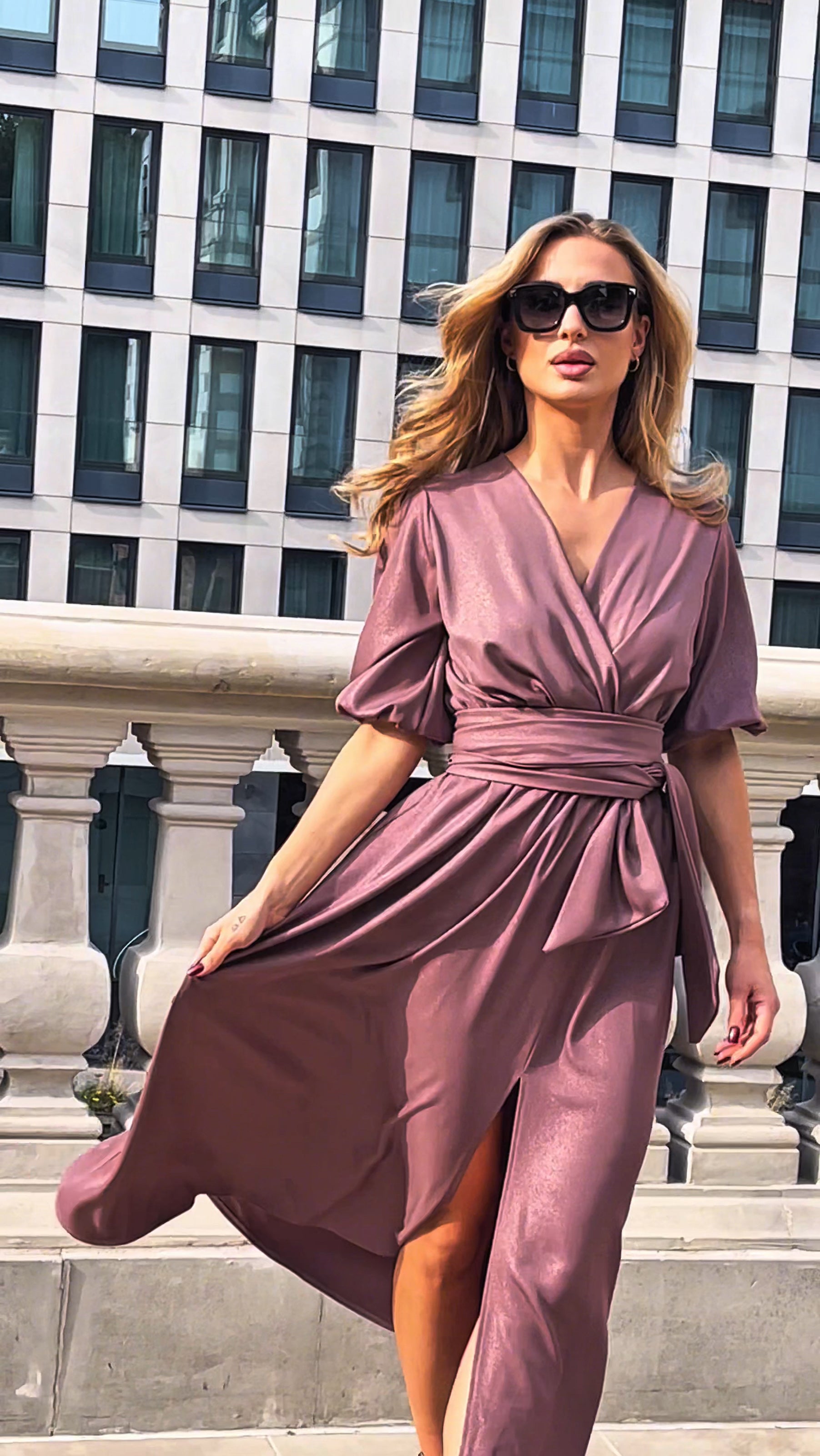 Sukienka midi w odcieniu jasnej mokki z subtelnym brokatowym połyskiem to elegancka propozycja łącząca klasykę z nowoczesnym wykończeniem. Rozkloszowany fason z rozcięciem na nodze pięknie podkreśla figurę i dodaje lekkości każdemu ruchowi. Talia z elastyczną gumką oraz szerokim pasem efektownie modeluje sylwetkę, a kopertowy dekolt w kształcie litery V nadaje całości kobiecego wdzięku. Bufiaste, krótkie rękawy wprowadzają romantyczny i subtelny akcent.