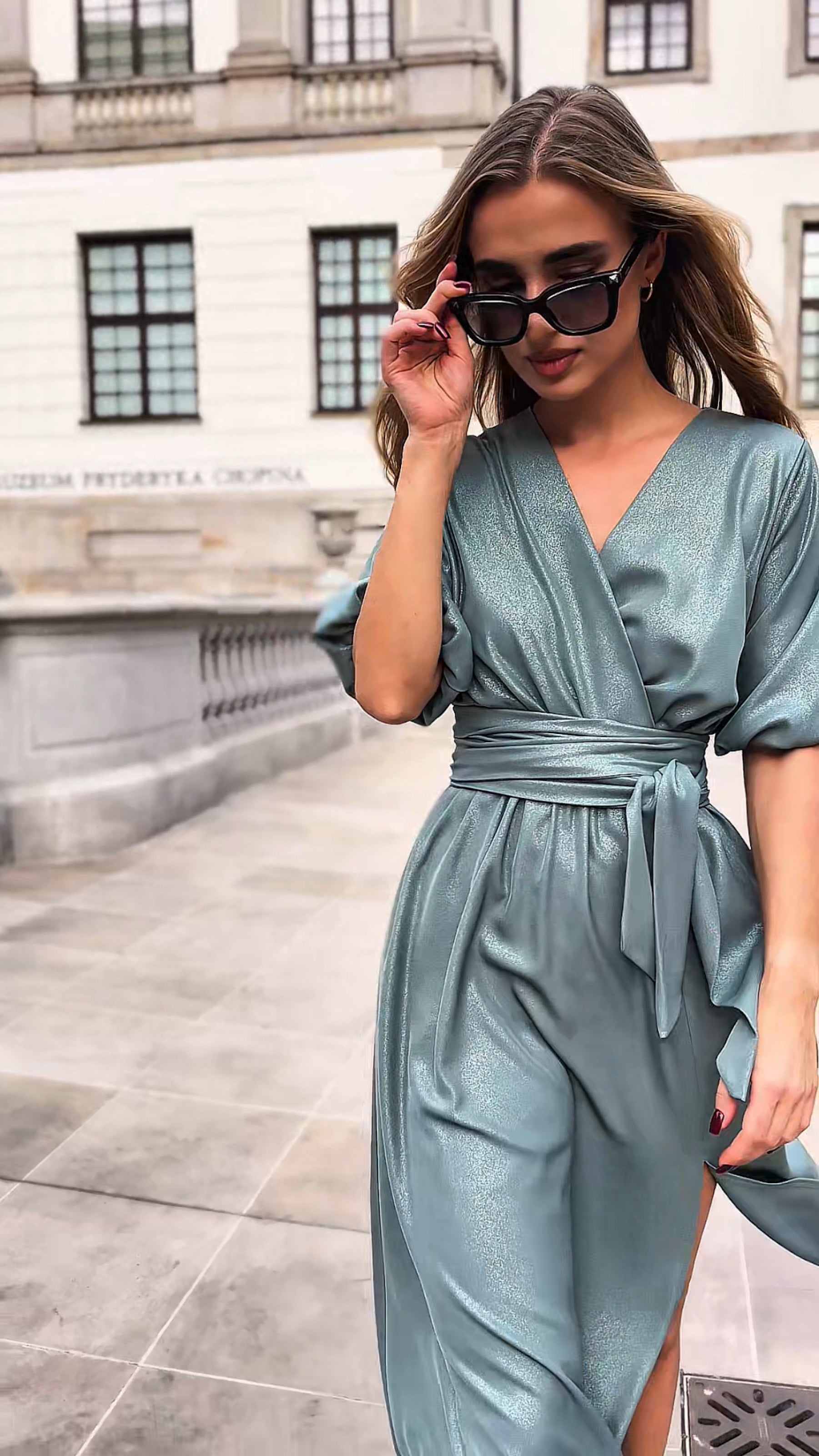 To idealna propozycja na uroczystości i przyjęcia – od eleganckich kolacji po wyjątkowe imprezy okolicznościowe. Szałwiowa zieleń w połączeniu z brokatowym blaskiem sprawia, że sukienka prezentuje się świeżo, modnie i efektownie, gwarantując komfort oraz stylowy wygląd przez całą noc.