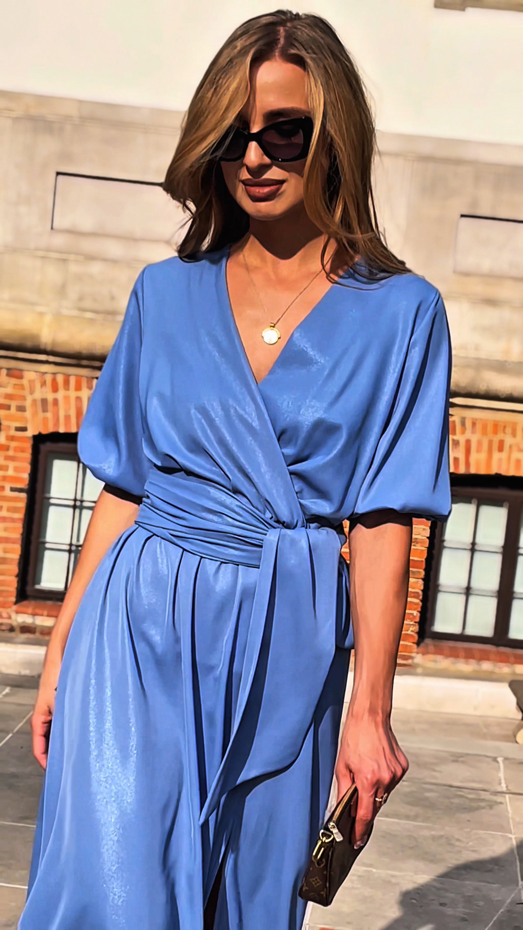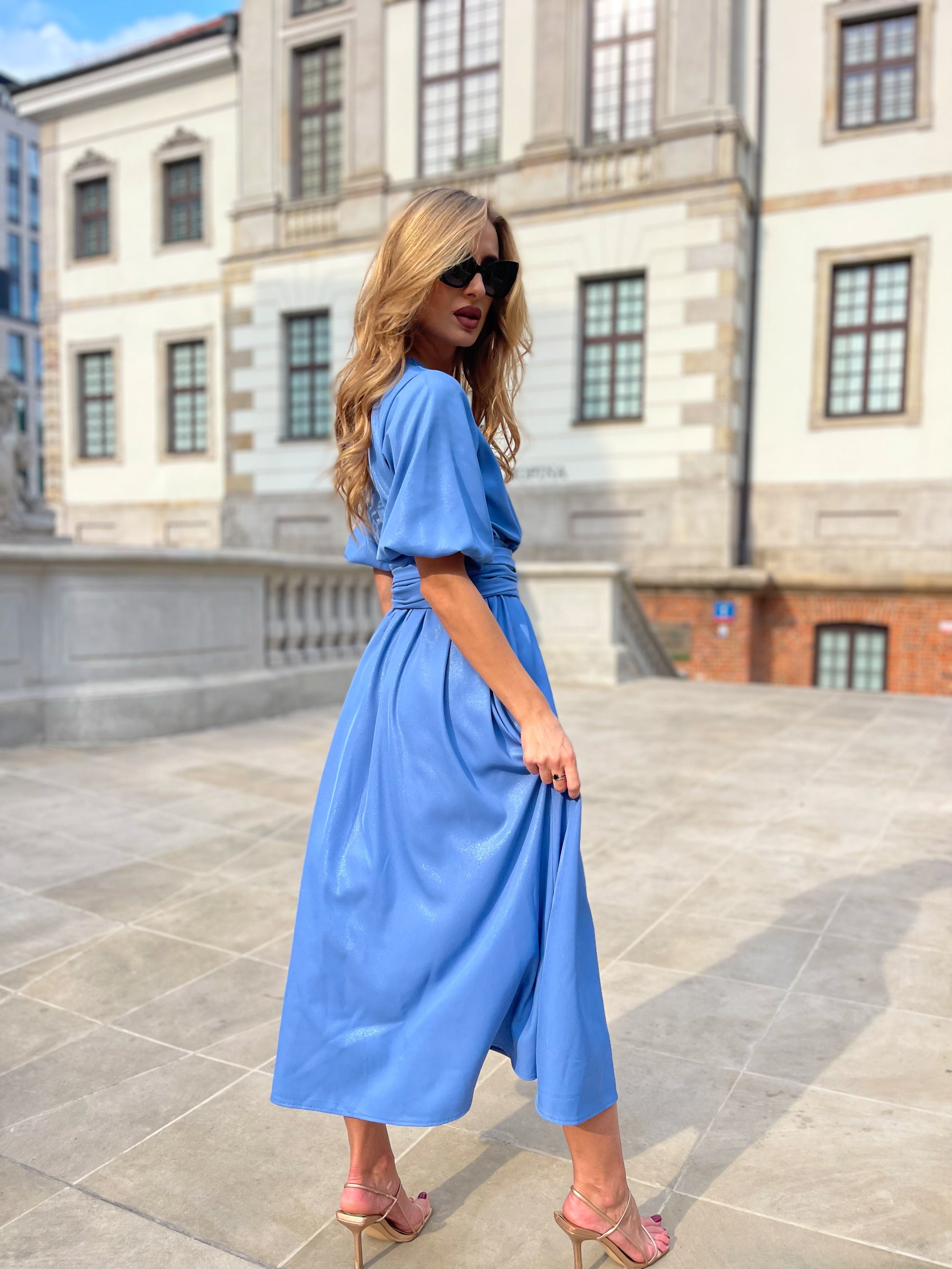 Sukienka midi w kolorze jasnego jeansu z wtopionym brokatem to stylowa propozycja, która łączy kobiecość z nowoczesnym akcentem. Rozkloszowany krój z rozcięciem na nodze podkreśla sylwetkę i dodaje lekkości całej stylizacji. Talia z elastyczną gumką i szerokim pasem pięknie modeluje figurę, a kopertowy dekolt w kształcie litery V dodaje szyku i subtelnego uroku. Krótkie bufiaste rękawy wprowadzają delikatny, romantyczny detal.