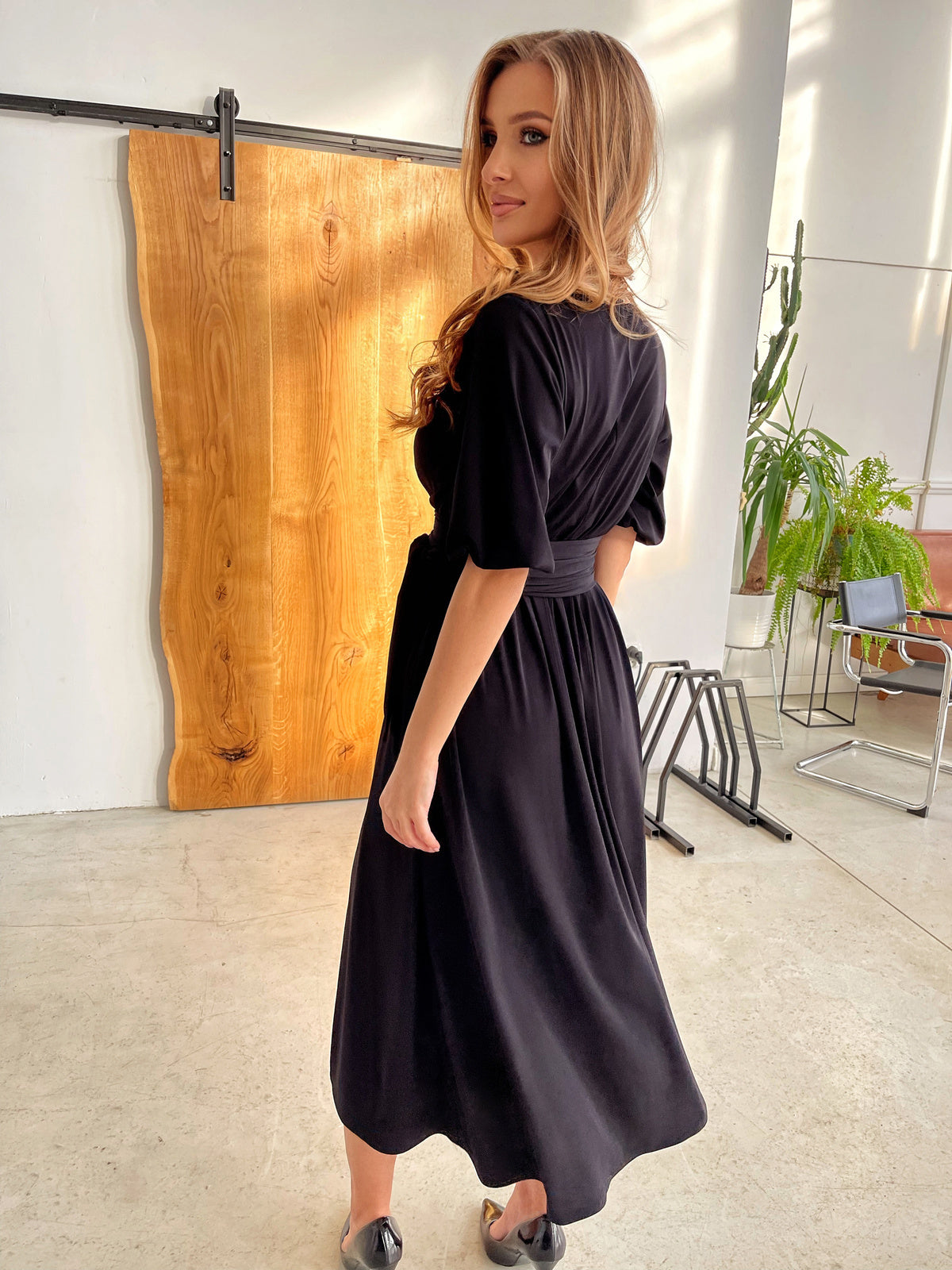 Czarna sukienka midi o rozkloszowanym kroju, sięgająca do połowy łydki, wykonana z elastycznej tkaniny, która dopasowuje się do sylwetki. Krótkie rękawy zakończone gumką tworzą subtelne bufki, dodając wdzięku. W talii wygodna gumka oraz pasek, które pięknie podkreślają figurę, a dekolt w kształcie litery "V" na zakładkę nadaje całości kobiecego charakteru. Obszerna spódnica zapewnia komfort i swobodę ruchów, idealnie łącząc elegancję z wygodą.
