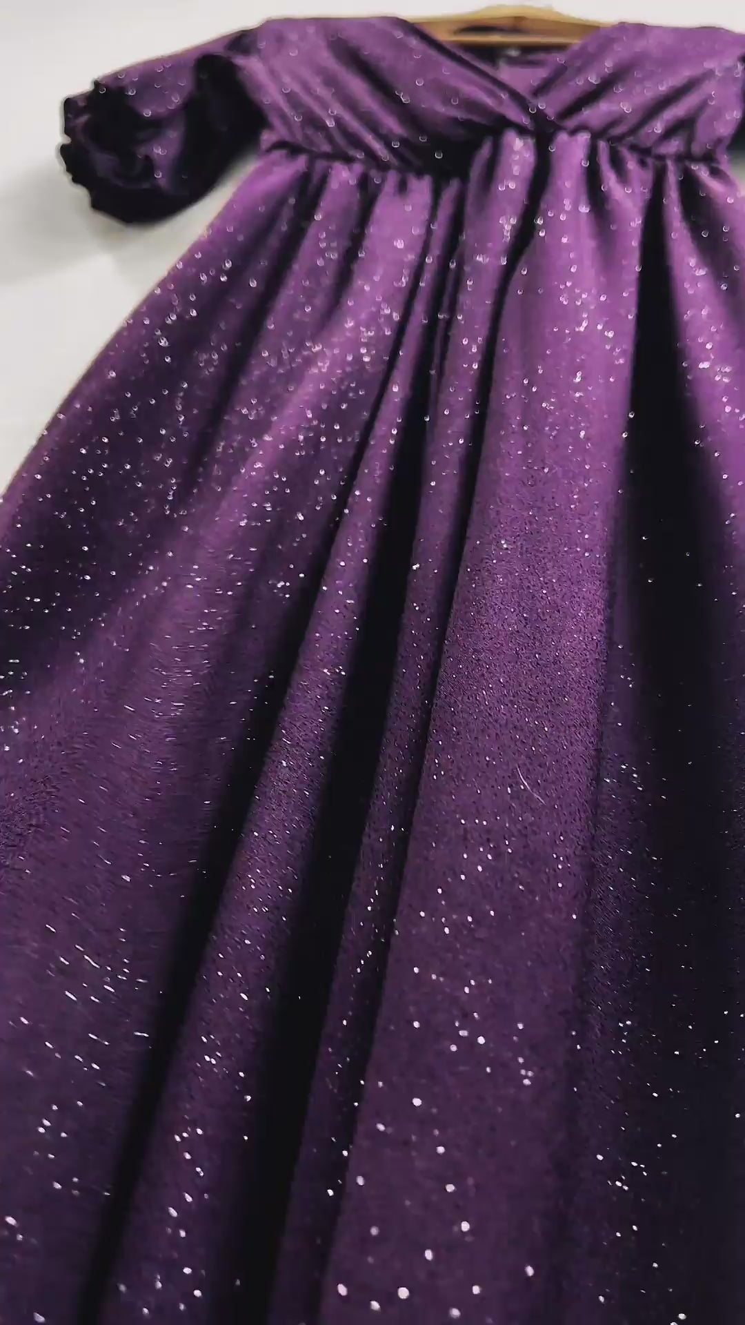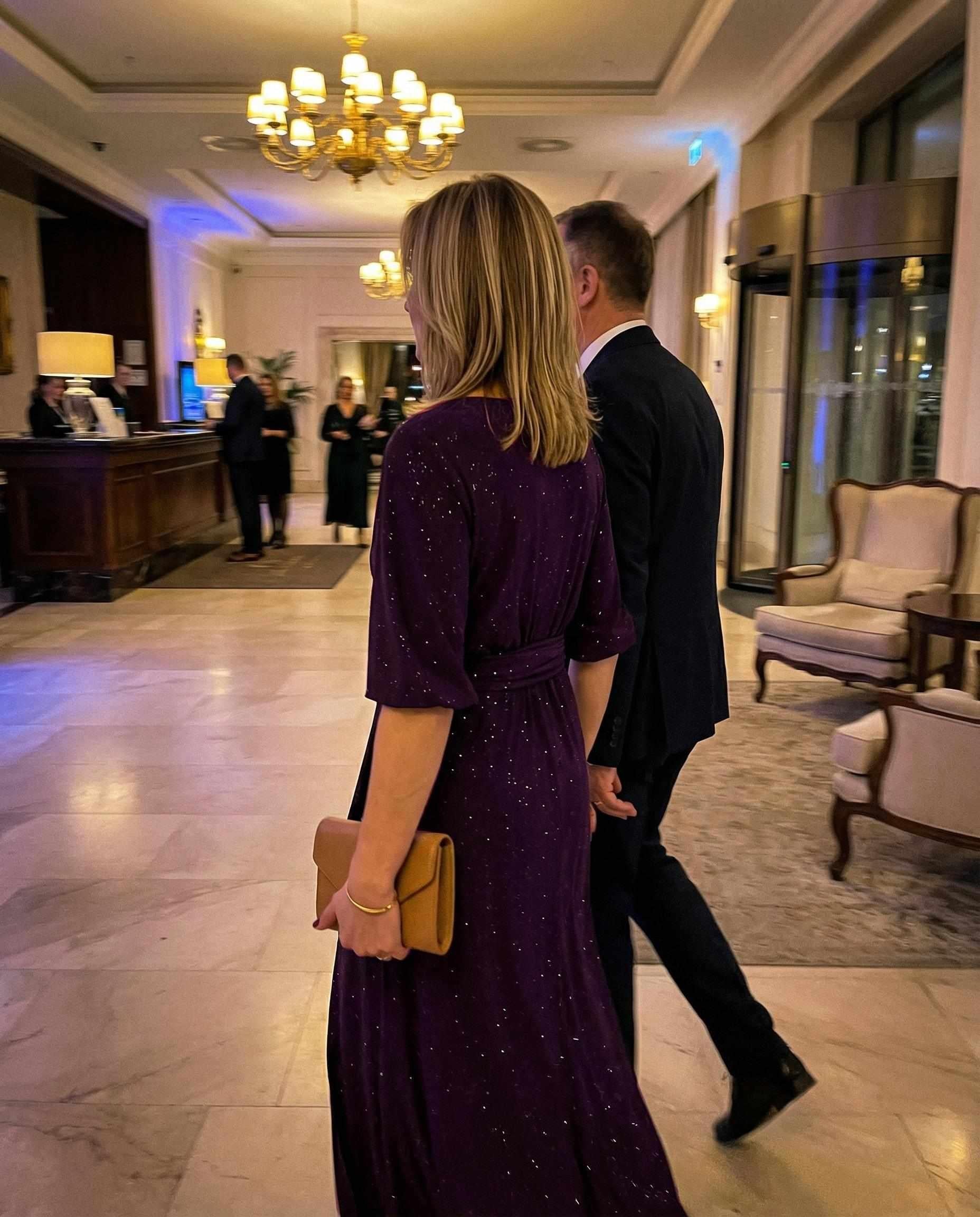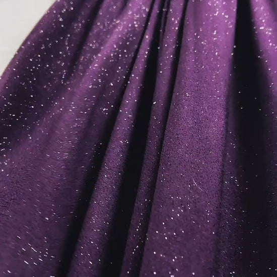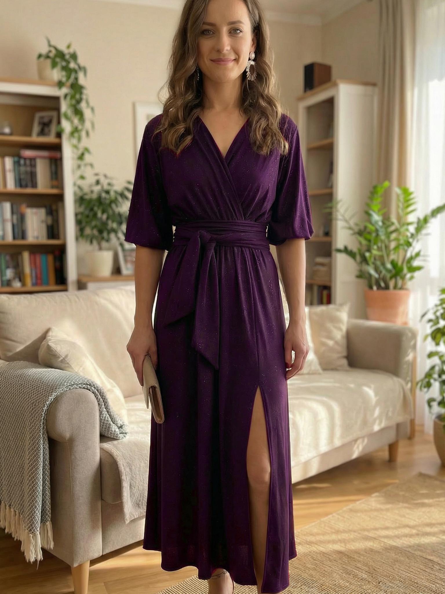 Sukienka midi w głębokim fiolecie z subtelnymi drobinkami brokatu to propozycja dla kobiet, które cenią elegancję połączoną z wyrazistym charakterem. Lekko rozkloszowany krój z finezyjnym rozcięciem na nogę zapewnia swobodę ruchów i dodaje stylizacji zmysłowości. Talia została zaakcentowana elastyczną gumką oraz eleganckim pasem, który pięknie modeluje sylwetkę. Kopertowy dekolt w kształcie litery V oraz krótkie, delikatnie bufiaste rękawy nadają całości szyku i romantycznej lekkości.