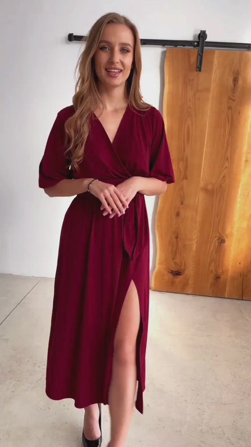 Bordowa sukienka midi o rozkloszowanym kroju to klasyczna propozycja pełna kobiecego uroku. Obszerna spódnica sięgająca do połowy łydki pięknie układa się podczas ruchu, a gumka w talii z dołączonym pasem podkreśla figurę. Krótkie rękawy zakończone gumką tworzą delikatne bufki, które nadają romantycznego charakteru. Kopertowy dekolt w serek subtelnie eksponuje szyję, podkreślając elegancję całej stylizacji.