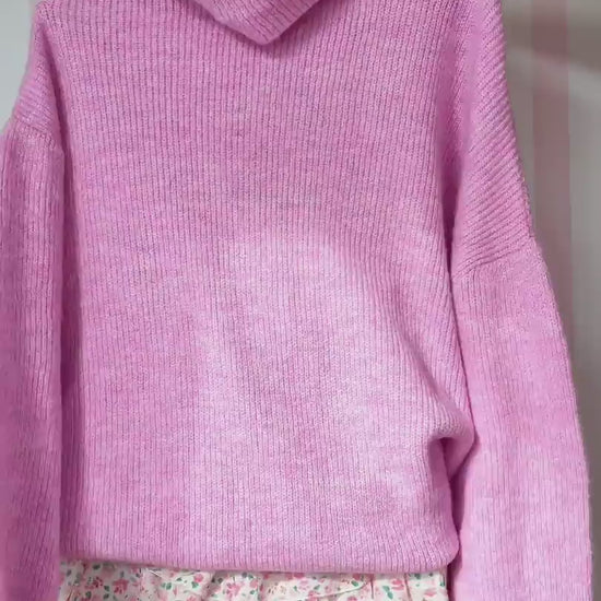 Ten luźny sweter oversize w pudrowym różu z melanżową kontrastową nitką to definicja komfortu i stylu w chłodne dni. Długie rękawy i mięsisty golf otulą Cię ciepłem, zapewniając jednocześnie wyjątkowy wygląd. Dzięki swojej długości zakrywającej pośladki, sweter świetnie komponuje się zarówno z legginsami, jak i dopasowanymi jeansami.