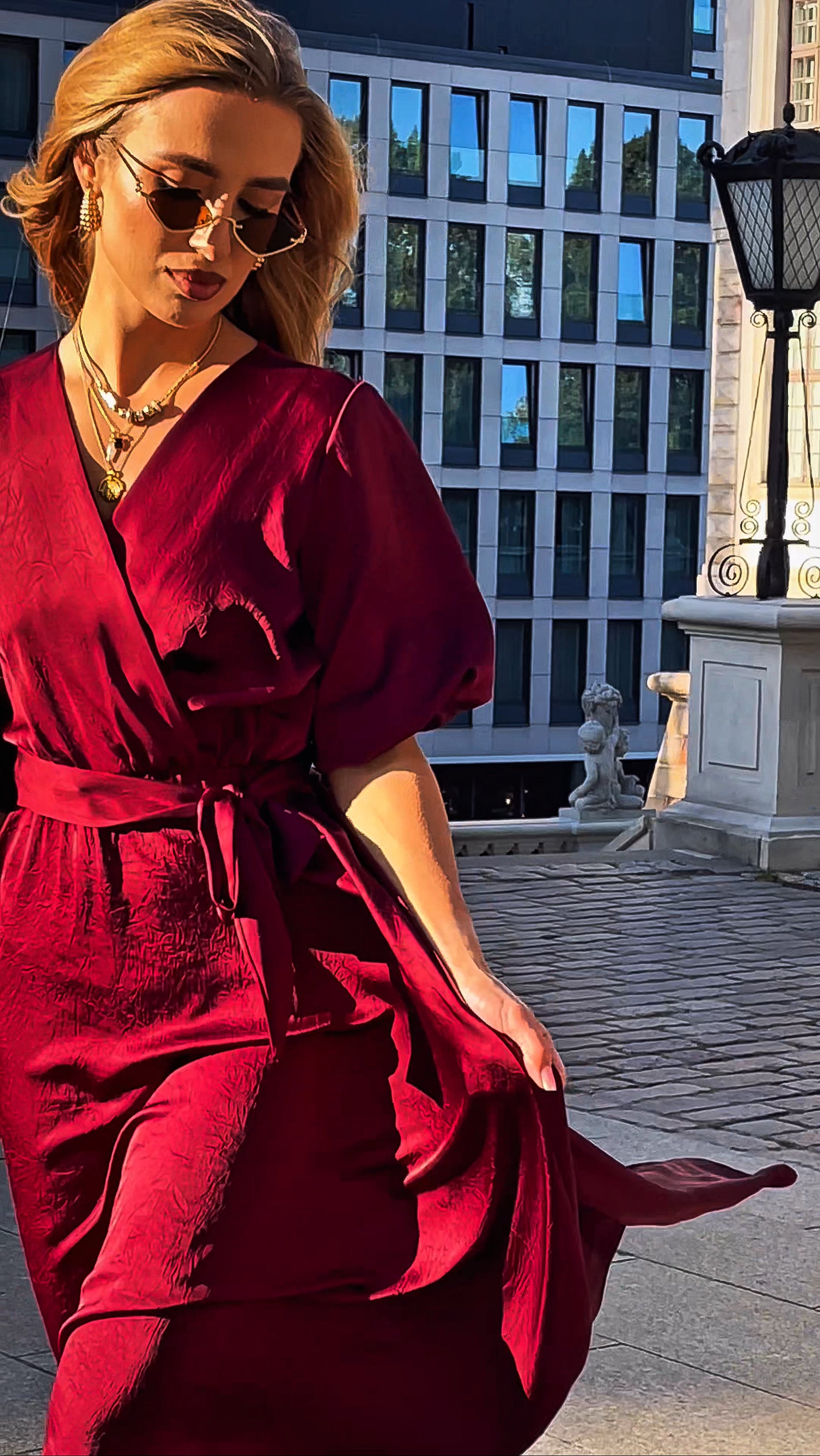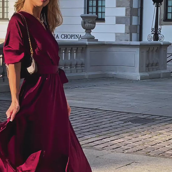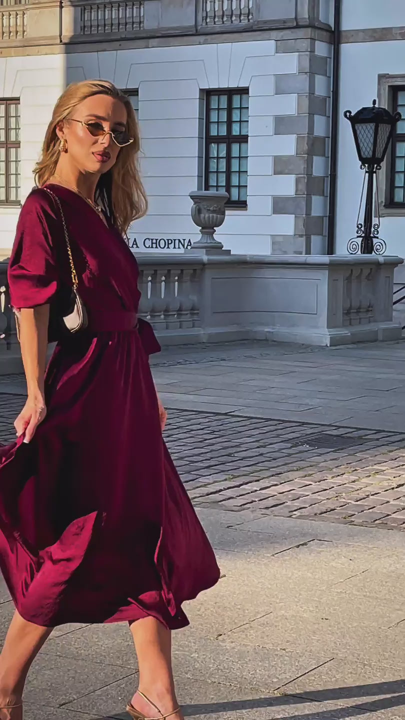 Sukienka z lekko drapowanej tkaniny w odcieniu głębokiego bordo to elegancka propozycja zarówno na letnie przyjęcia, jak i wyjątkowe wieczory. Delikatna struktura materiału nadaje jej szlachetności, a kopertowy dekolt subtelnie podkreśla linię szyi i optycznie wysmukla sylwetkę. Elastyczna talia gwarantuje komfort noszenia, a bufiaste rękawy dodają całości romantycznego uroku. Długość midi czyni tę kreację uniwersalną – sprawdzi się na wielu okazjach, od kameralnych spotkań po uroczyste bankiety. To wybór dla kobiet, które cenią ponadczasową klasykę w modnym wydaniu.