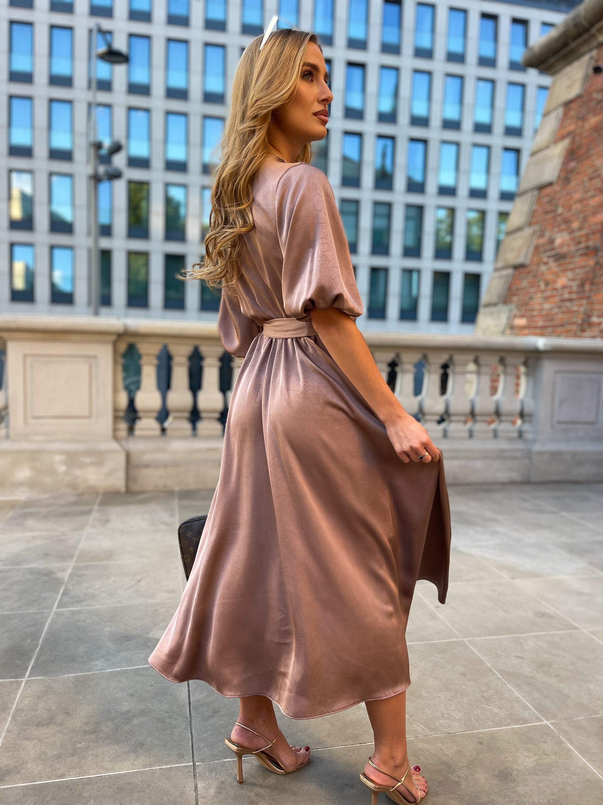 Satynowa drapowana sukienka mokka na wesele midi z bufiastymi rękawami rozkloszowana id:2179