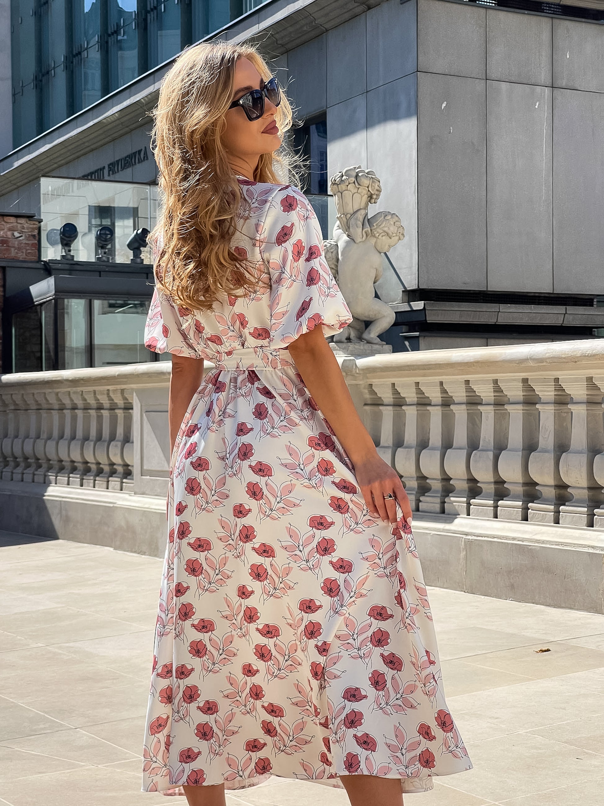 Sukienka w odcieniu złamanej bieli z nadrukiem czerwonych kwiatów to pełna uroku i świeżości propozycja na lato. Lekki, przewiewny materiał pięknie układa się w ruchu, tworząc romantyczny i kobiecy efekt. Kopertowy dekolt subtelnie podkreśla linię biustu, a wiązanie w talii akcentuje sylwetkę i zapewnia wygodne dopasowanie. Krótkie, luźne rękawy dodają lekkości, a długość midi sprawia, że sukienka jest idealna zarówno na co dzień, jak i na bardziej eleganckie wyjścia.