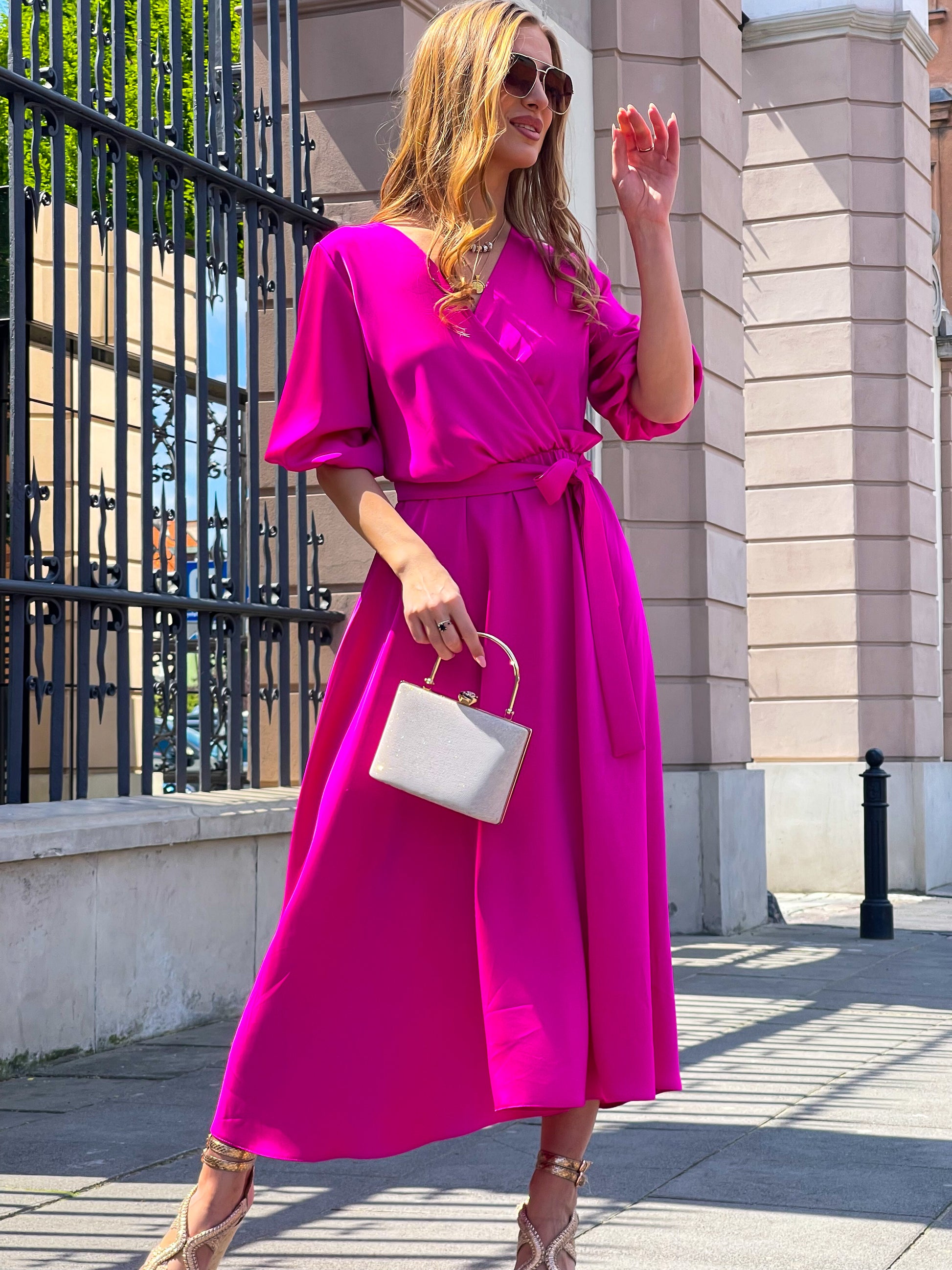 Sukienka z satyny w kolorze fuksji to wyrazista propozycja na letnie i wieczorowe wyjścia. Lekko połyskujący materiał dodaje elegancji i przyciąga spojrzenia. Kopertowy dekolt podkreśla kobiecą sylwetkę, a elastyczna talia zapewnia idealne dopasowanie. Bufiaste rękawy wprowadzają romantyczny akcent do całości. Długość midi sprawia, że sukienka jest uniwersalna i odpowiednia na wiele okazji. To stylowy wybór dla kobiet ceniących połączenie klasyki z odważnym kolorem.