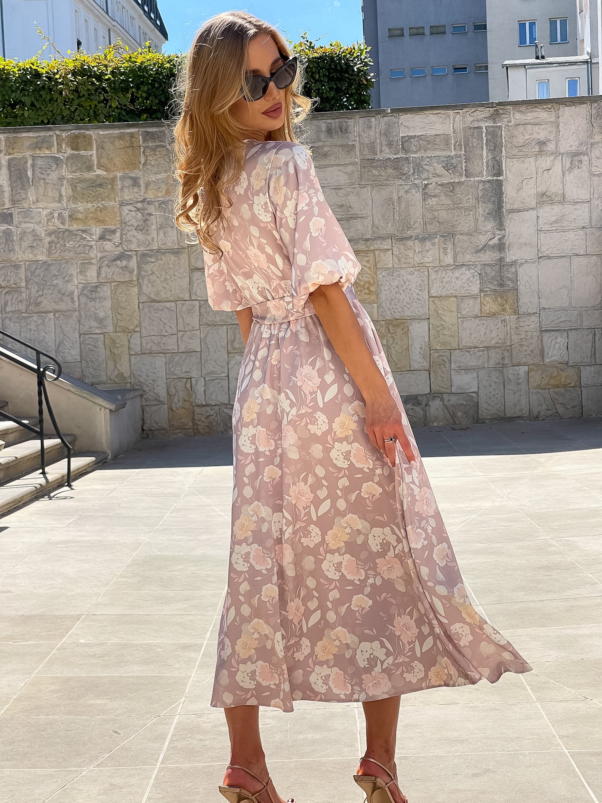 Sukienka w odcieniu jasnej mokki z kwiatowym motywem to wyjątkowo kobieca i lekka propozycja na cieplejsze dni. Zwiewny materiał subtelnie układa się na sylwetce, tworząc romantyczny, a zarazem elegancki look. Kopertowy dekolt pięknie podkreśla linię biustu, a wiązanie w talii zapewnia wygodne dopasowanie i akcentuje figurę. Bufiaste rękawy dodają całości delikatności, a długość midi sprawia, że sukienka jest odpowiednia zarówno na co dzień, jak i na specjalne okazje – garden party, komunie czy letnie przyjęcia.