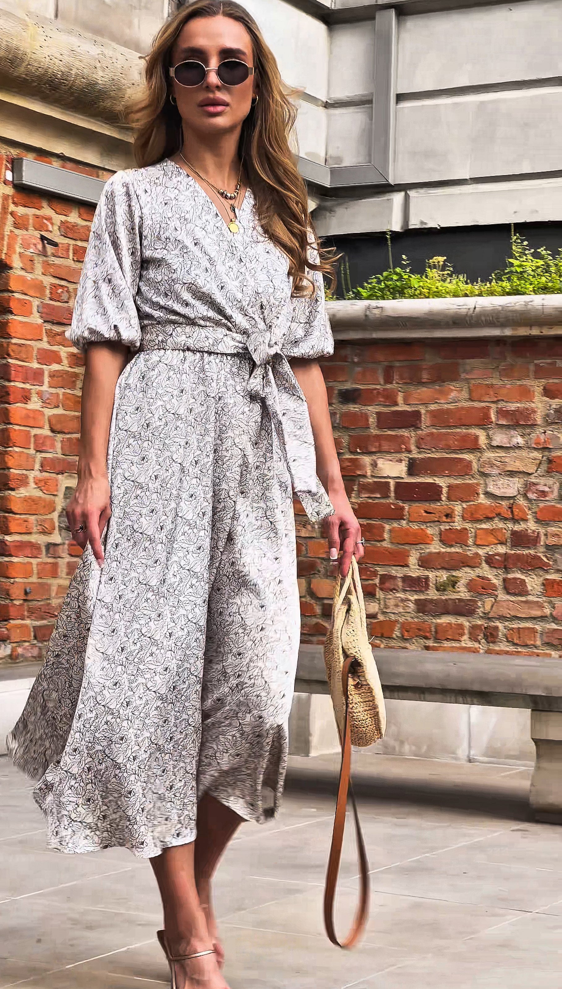 Sukienka w białym odcieniu z czarnym, rysowanym motywem kwiatowym to wyjątkowo kobieca i lekka propozycja na cieplejsze dni. Zwiewny materiał subtelnie układa się na sylwetce, tworząc romantyczny, a zarazem elegancki look. Kopertowy dekolt pięknie podkreśla linię biustu, a wiązanie w talii zapewnia wygodne dopasowanie i akcentuje figurę. Bufiaste rękawy dodają całości delikatności, a długość midi sprawia, że sukienka jest odpowiednia zarówno na co dzień, jak i na specjalne okazje – garden party, komunie czy letnie przyjęcia.