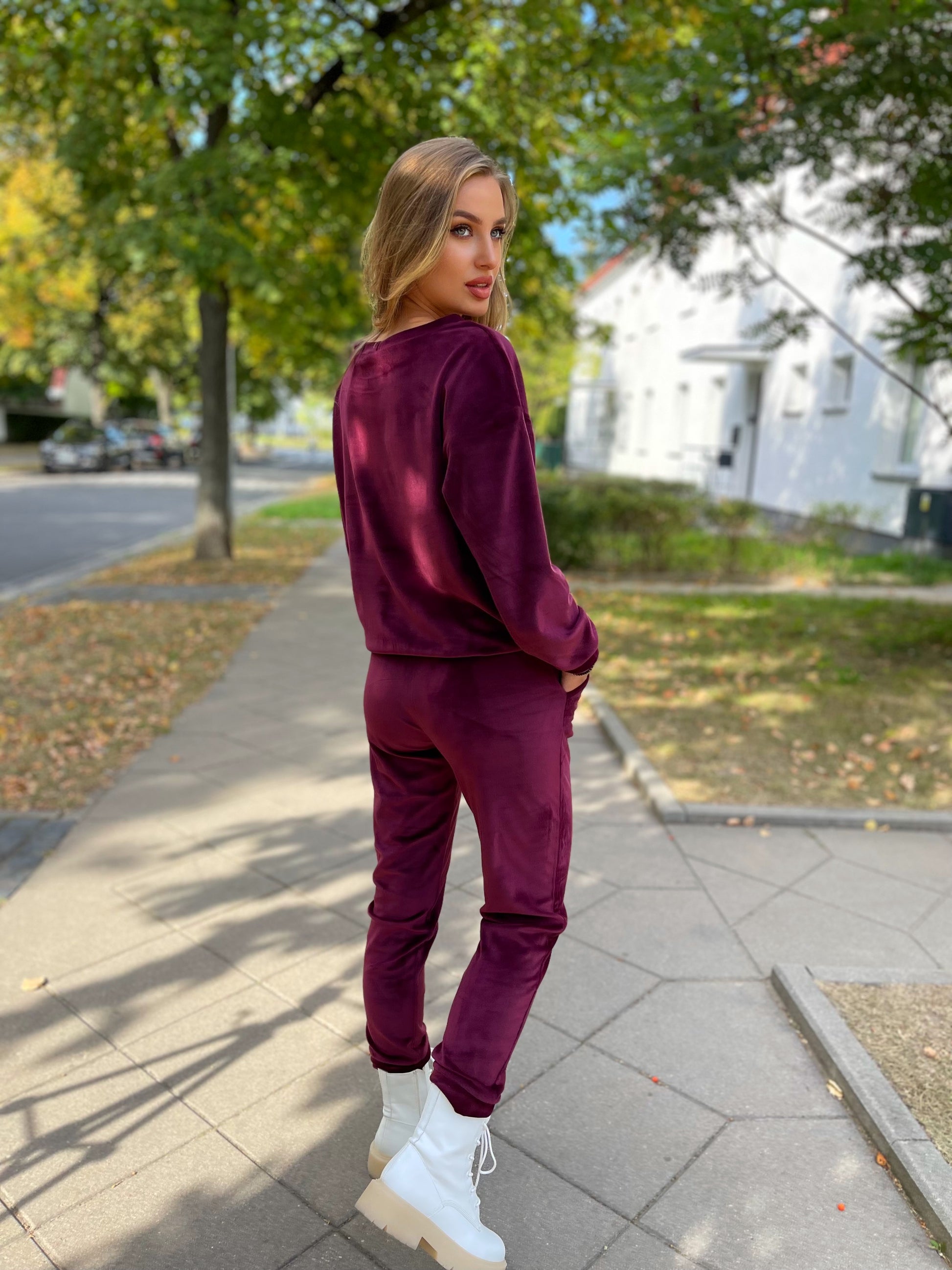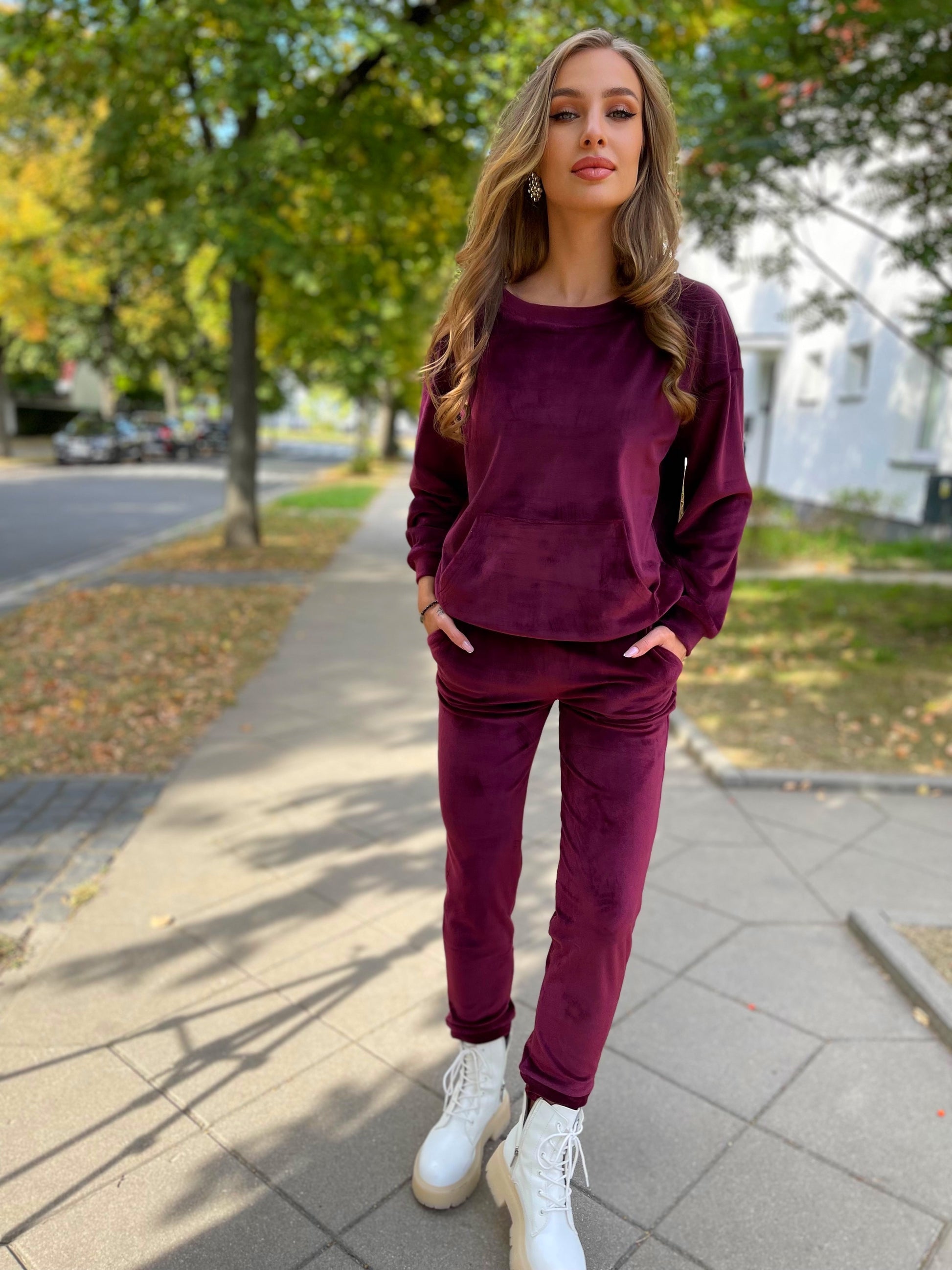 Śliwkowy welurowy komplet dresowy z bluzą kangurką id:737