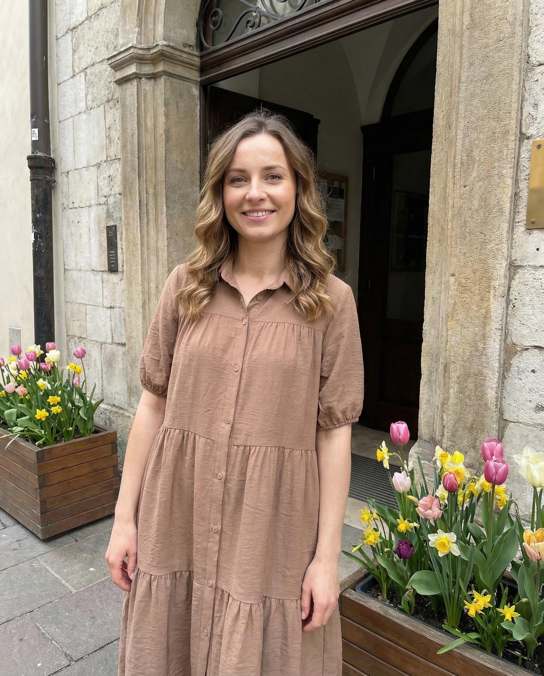 Ta wyjątkowa sukienka to idealne połączenie klasycznej elegancji z luźnym, wakacyjnym stylem. Wykonana z lekkiego, strukturalnego materiału, zapewnia maksymalny komfort noszenia nawet w najcieplejsze dni. Jej charakterystyczny, kaskadowy dół dodaje sylwetce lekkości i subtelnego dziewczęcego uroku. Krótkie, delikatnie bufiaste rękawy oraz tradycyjny kołnierzyk tworzą harmonijną całość, która sprawdzi się na wiele okazji. Dzięki zapięciu na guziki na całej długości, model ten może służyć również jako stylowa narzutka do letnich zestawów. To ponadczasowa propozycja dla kobiet, które cenią sobie swobodę ruchów bez rezygnacji z modnego wyglądu.
