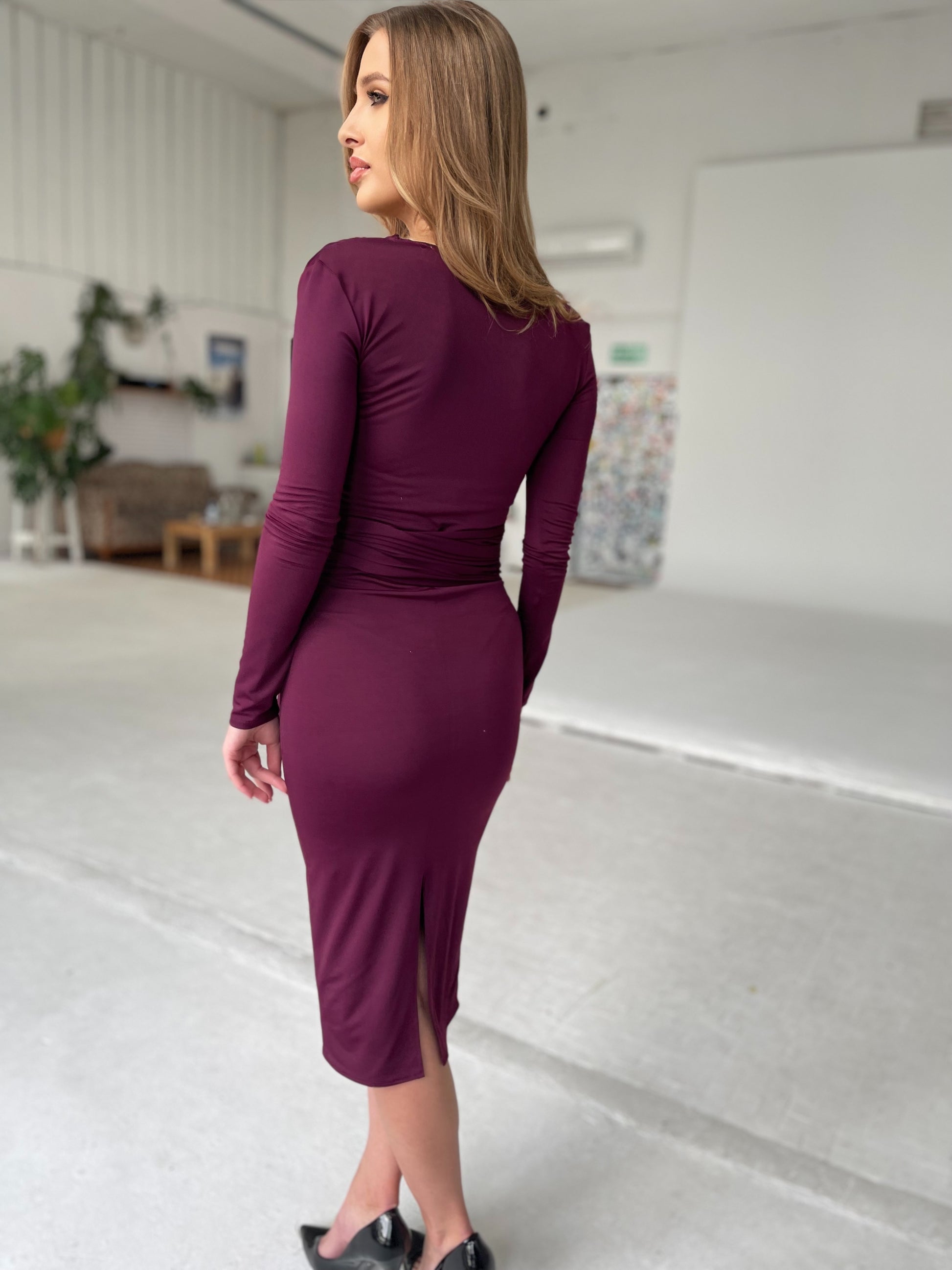 Elegancka śliwkowa sukienka midi za kolano, idealna dla kobiet, które cenią sobie wyrafinowany styl i wyjątkowy komfort. Dopasowany ołówkowy krój i elastyczna tkanina z podszewką doskonale podkreślają sylwetkę, a marszczenie z przodu w talii oraz szeroki pas do wiązania dodają uroku i subtelnie modelują figurę. Zakładany kopertowy dekolt oraz marszczenia na ramionach, które tworzą delikatne bufki, nadają całości modowego charakteru, a długie rękawy dopełniają elegancki wygląd.