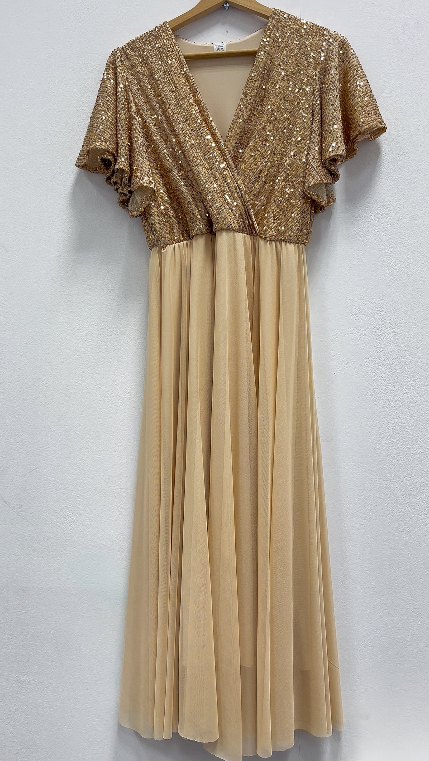 Złota sukienka wieczorowa midi z cekinową górą i siateczkowym rozkloszowanym dołem id:2257