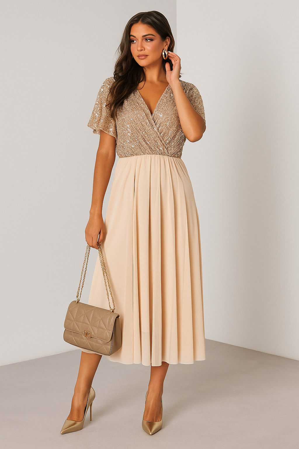 Olśniewająca sukienka stworzona na wyjątkowe okazje. Góra zdobiona cekinami pięknie mieni się w świetle, nadając całości luksusowego charakteru. Dół wykonany z lekkiej siateczki subtelnie opływa sylwetkę, a wszyta podszewka zapewnia komfort noszenia. Krój z kopertowym dekoltem podkreśla kobiecość i dodaje elegancji. To doskonała propozycja na wesela, bale, przyjęcia czy inne uroczystości. Sukienka łączy w sobie szyk, wygodę i ponadczasowy urok.