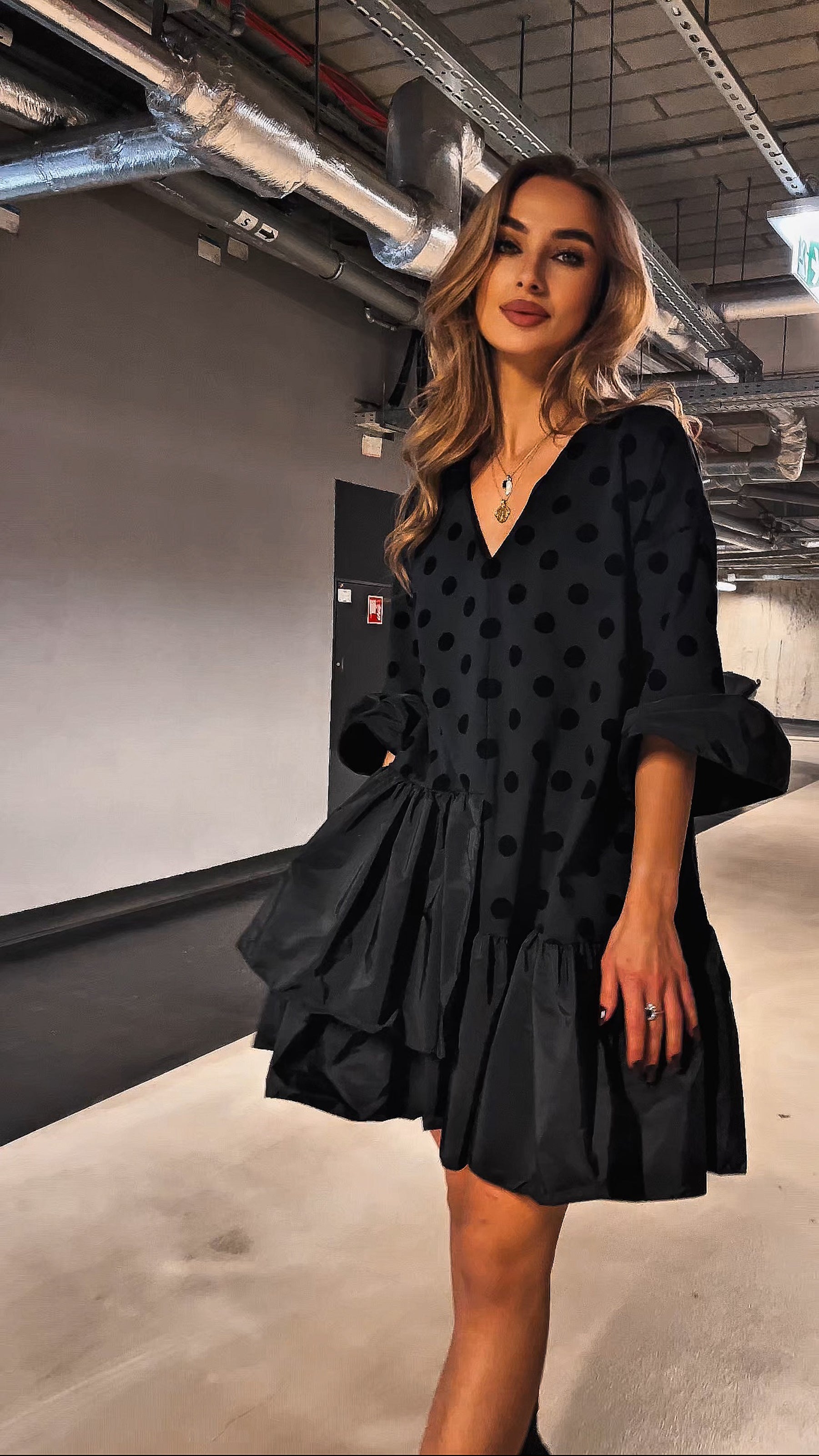 Czarna sukienka z welurowymi kropkami to połączenie elegancji i swobodnego stylu. Wykonana z przyjemnej w dotyku tkaniny, zachwyca modnym krojem z falbanami, które nadają jej lekkości i dziewczęcego uroku. Dekolt w serek subtelnie wysmukla szyję, a luźniejszy fason gwarantuje komfort noszenia przez cały dzień. Rękawy zakończone efektownymi falbanami dodają całości wyjątkowego charakteru. Model doskonały zarówno na co dzień, jak i na spotkania w gronie przyjaciół czy wieczorne wyjścia.