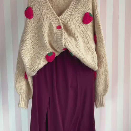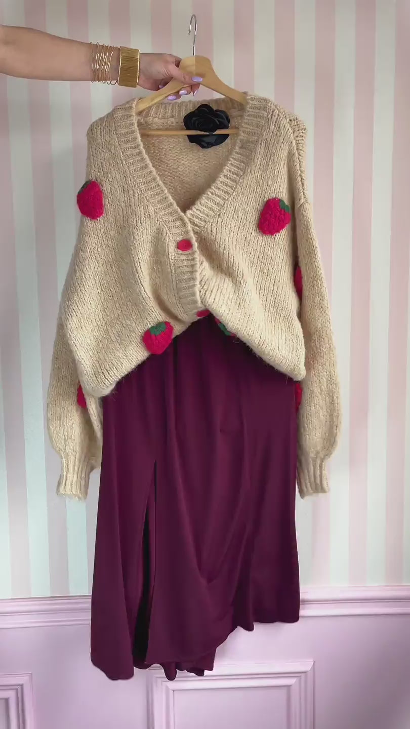 Rozpinany kardigan w eleganckim beżowym odcieniu, ozdobiony dużymi czerwonymi guzikami i wypukłymi aplikacjami w kształcie truskawek, które dodają mu niepowtarzalnego uroku. Luźny, oversize'owy krój i długie, obszerne rękawy zapewniają wygodę i modny wygląd. Dekolt w serek dodaje delikatności, a mieszanka materiałów z wełną i poliamidem sprawia, że sweter jest miękki i przyjemnie ciepły.