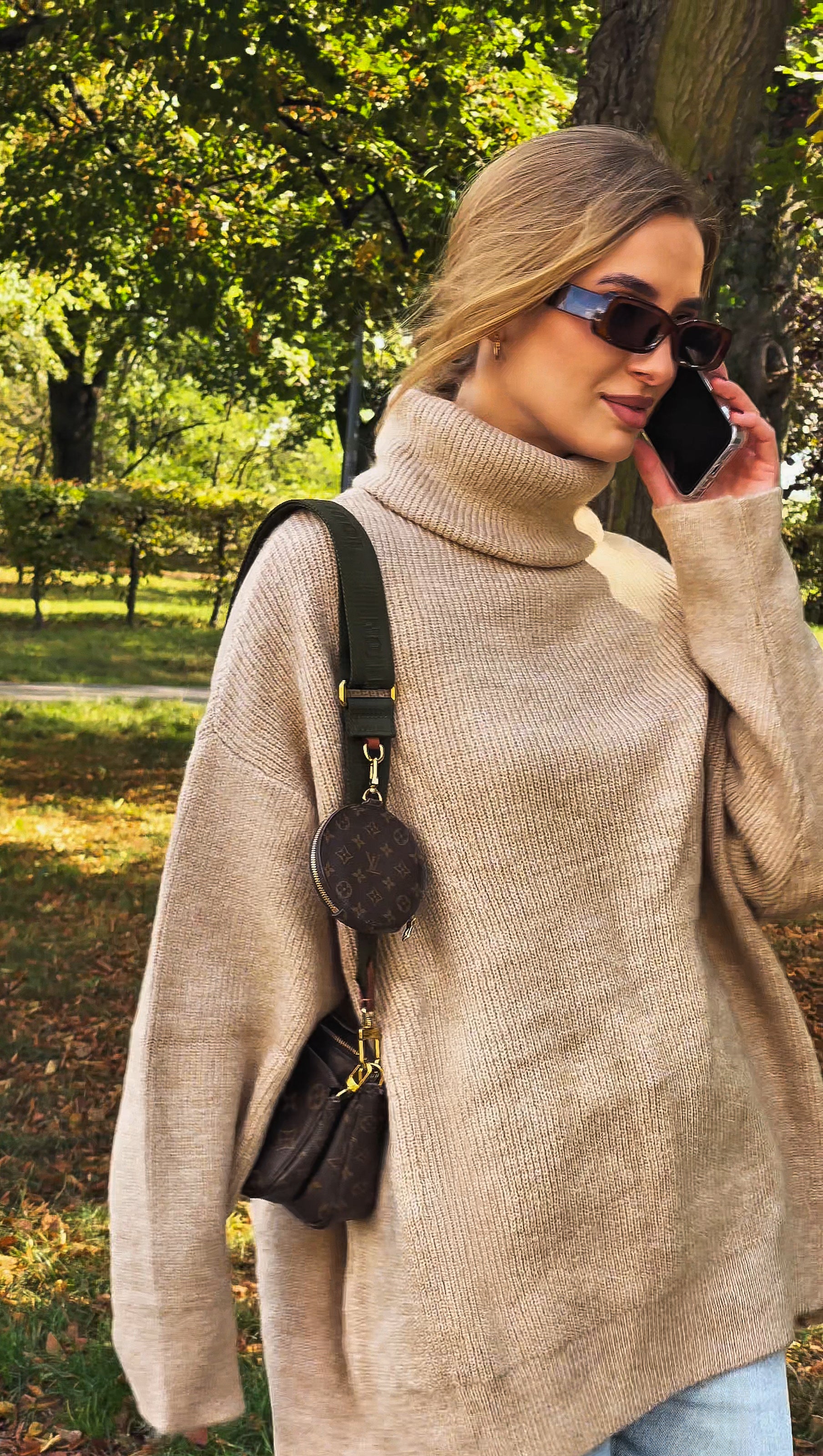 Stylowy sweter o swobodnym kroju to doskonały wybór na chłodniejsze dni. Wykonany z miękkiej, przyjemnej w dotyku dzianiny, zapewnia ciepło i komfort noszenia. Wysoki golf otula szyję, dodając elegancji i chroniąc przed zimnem. Klasyczny fason sprawia, że świetnie prezentuje się zarówno w zestawie ze spodniami, jak i ze spódnicą. Delikatny beż nadaje mu uniwersalnego charakteru oraz ponadczasowego uroku. To niezastąpiony element garderoby na jesień i zimę.