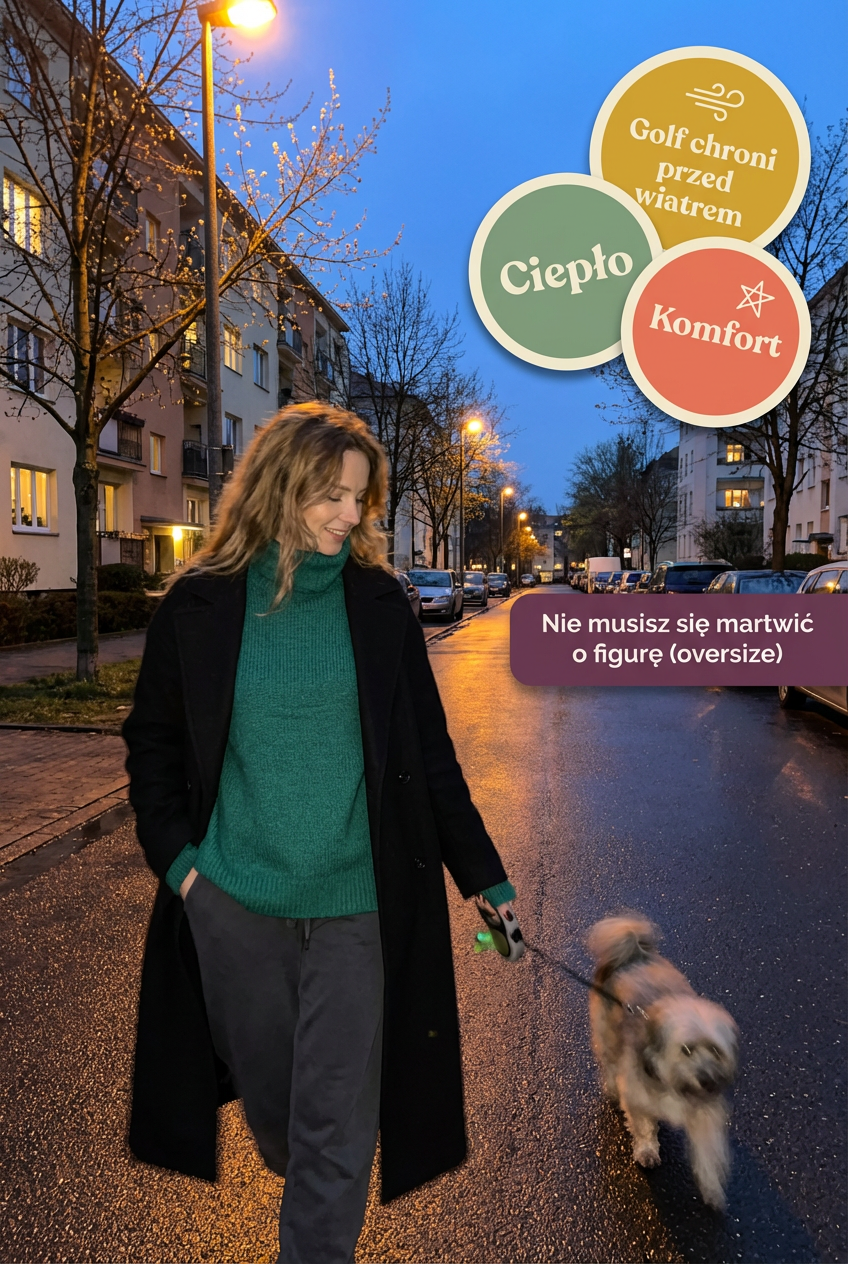 Stylowy sweter o swobodnym kroju to doskonały wybór na chłodniejsze dni. Wykonany z miękkiej, przyjemnej w dotyku dzianiny, zapewnia ciepło i komfort noszenia. Wysoki golf otula szyję, dodając elegancji i chroniąc przed zimnem. Klasyczny fason sprawia, że świetnie prezentuje się zarówno w zestawie ze spodniami, jak i ze spódnicą. Głęboka butelkowa zieleń nadaje mu wyjątkowego charakteru oraz ponadczasowego uroku. To niezastąpiony element garderoby na jesień i zimę.