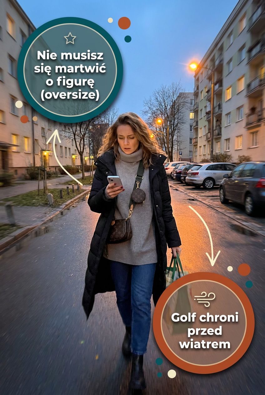 Stylowy sweter o luźnym kroju to idealny wybór na chłodniejsze dni. Wykonany z miękkiej, przyjemnej w dotyku dzianiny, zapewnia ciepło i komfort noszenia. Wysoki golf otula szyję, dodając elegancji i chroniąc przed zimnem. Uniwersalny fason sprawia, że doskonale komponuje się zarówno ze spodniami, jak i spódnicą. Odcień szarości podkreśla klasyczny, a zarazem modny charakter swetra. To ponadczasowy element garderoby na jesień i zimę.