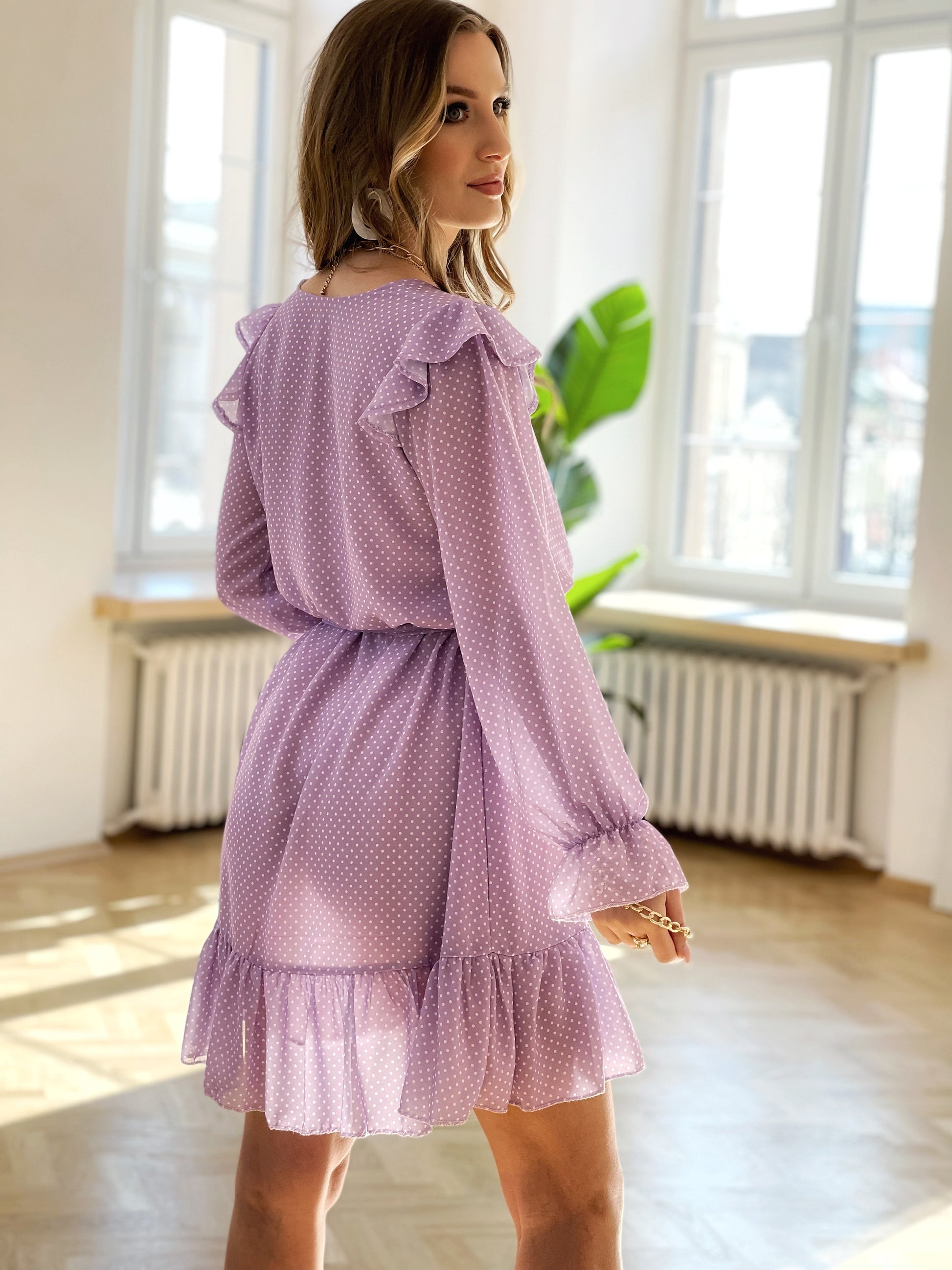 Pełna wdzięku, zwiewna i niezwykle kobieca – błękitna sukienka mini w drobne groszki to idealna propozycja na wiosenne dni i eleganckie okazje. Wykonana z lekkiej tkaniny z podszewką, zapewnia komfort noszenia i pięknie układa się na sylwetce. Kopertowy dekolt na zakładkę podkreśla biust i ułatwia karmienie, czyniąc sukienkę praktycznym wyborem dla mam. Rękawy długie, zakończone gumkami, można regulować według preferencji, a delikatne falbanki na ramionach, na dole rękawów i spódnicy dodają jej dziewczęcego uroku. Gumka w talii oraz dołączony pasek pozwalają na subtelne podkreślenie sylwetki.