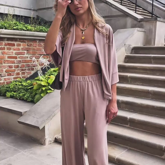 Składa się z topu bandeau, luźnych spodni z gumką oraz krótkiej narzutki w stylu kimono.